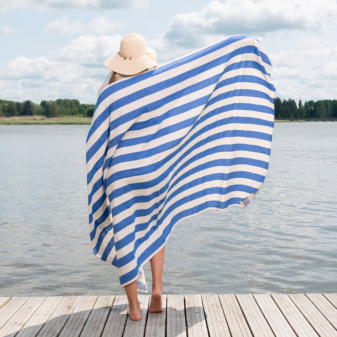 Blau gestreiftes Halbleinen-Strandtuch. Den Stoff des Artikels haben wir in breiten milchweißen (gelblichweißen) und kräftig blauen Streifen aus Leinen- und Baumwollgarn gewebt, um einen maritimen Charakter zu verleihen. Sie können aus zwei Größen wählen, zum Strand, See, Pool, Sauna mitnehmen. Das Strandtuch aus leichtem Stoff ist besonders platzsparend, nimmt die Feuchtigkeit super gut auf, trocknet schnell. Speziell gewaschene Leinen-Baumwollmischung ist sanft zur Haut.