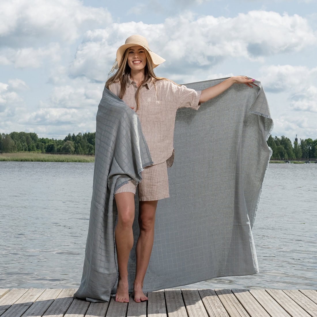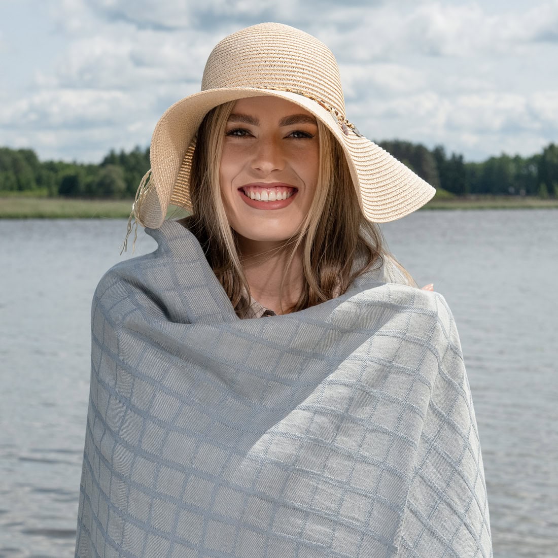 - Farbe: blaugraues und hellgraues Garn zusammengewebt