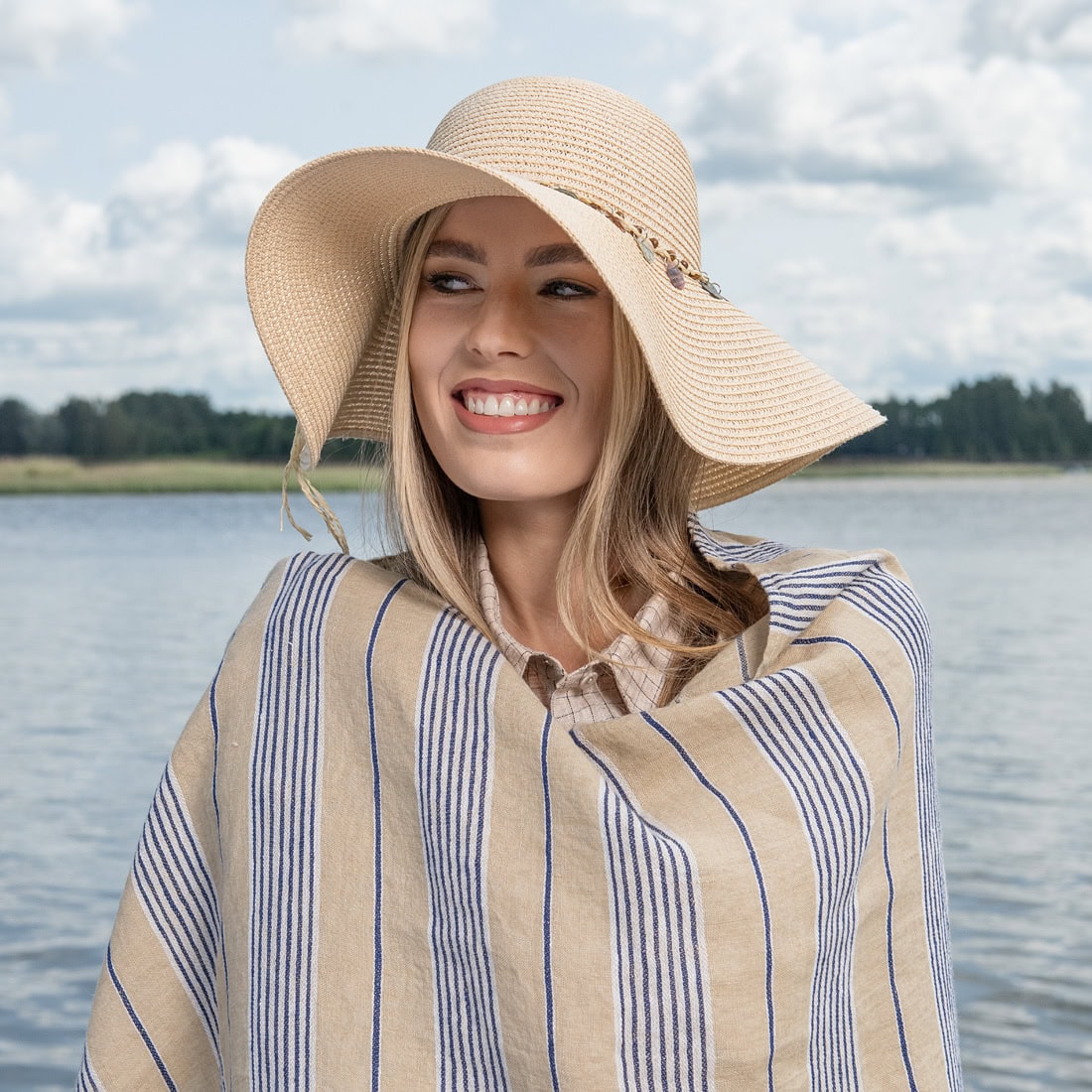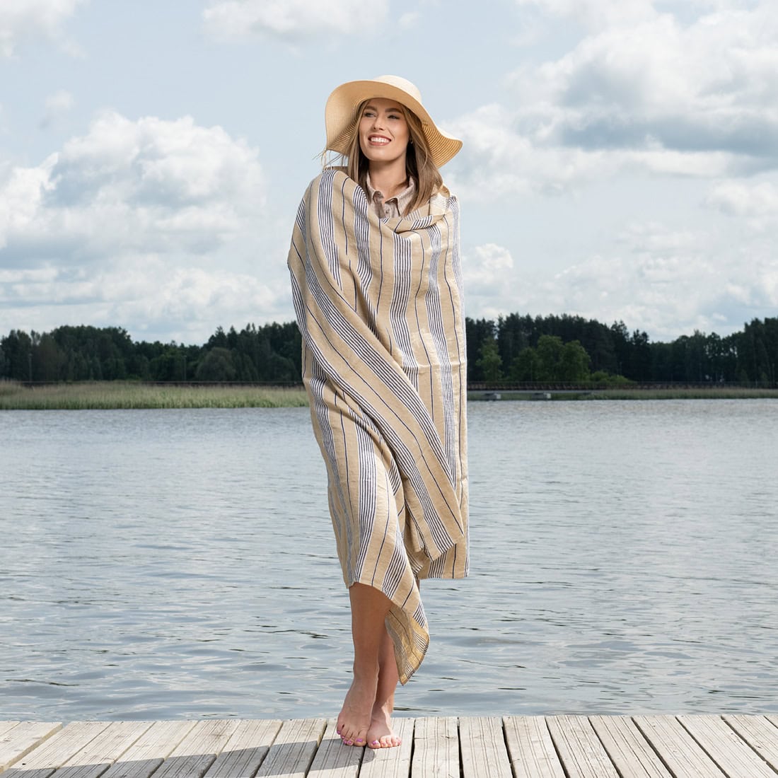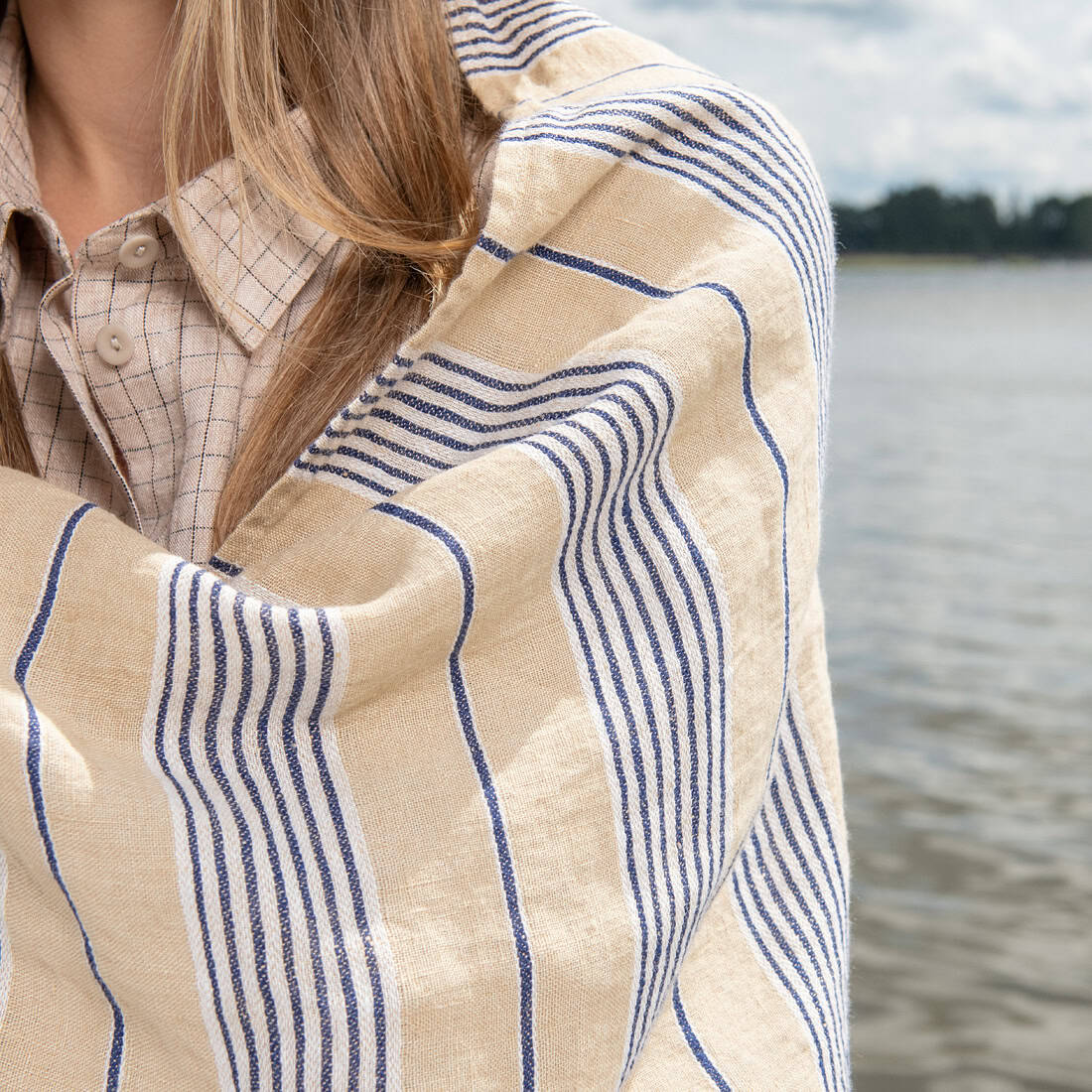 - Farbe: helles gelblichbraunes, milchweißes (gelblichweißes) und dunkelblaues Garn zusammengewebt