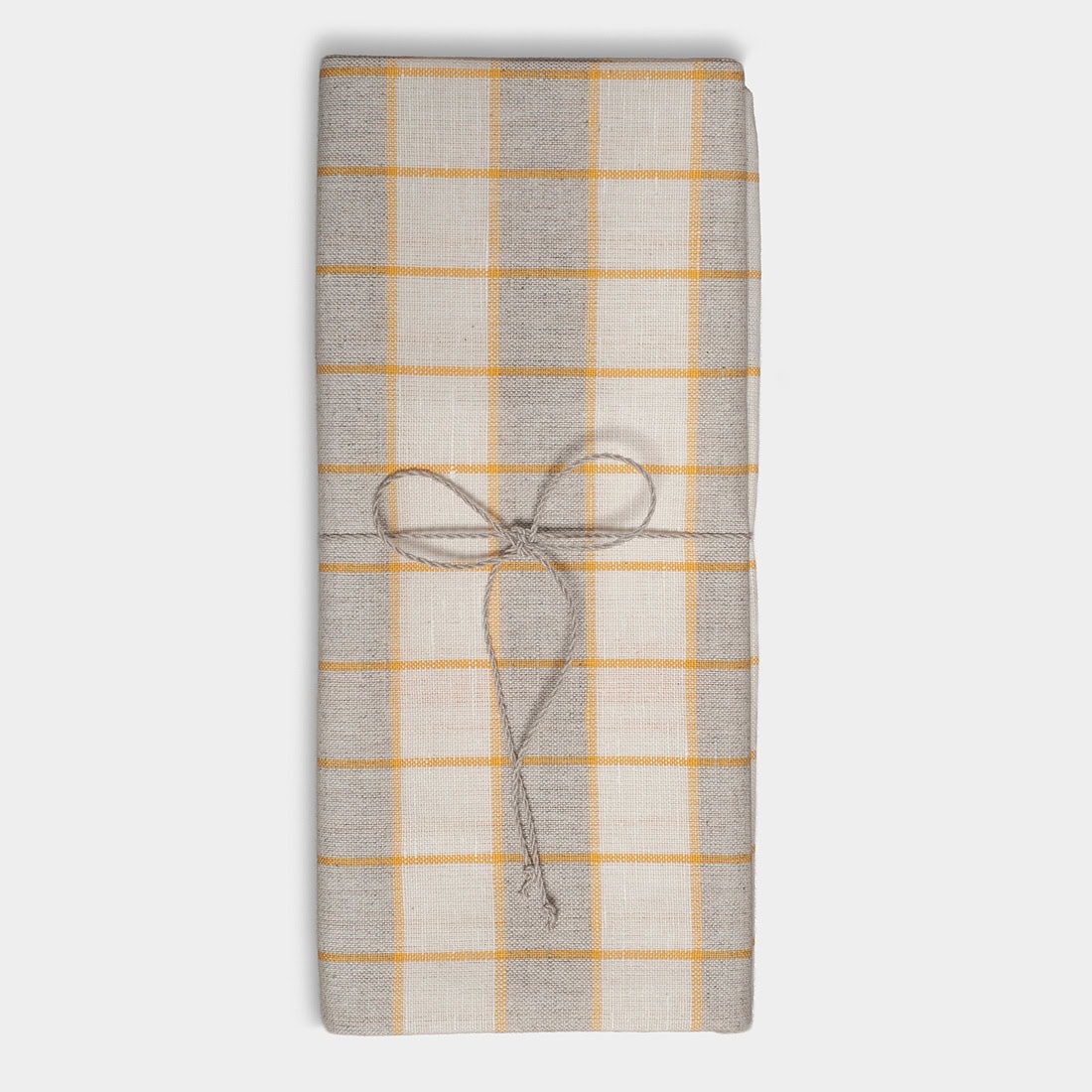 Beige und milchweiß gestreiftes Halbleinen-Küchentuch mit gelben vertikalen und horizontalen Streifen, die Karos bilden. Robust, groß (70 cm x 70 cm), langlebig und praktisch - das Küchentuch findet sein Platz in Ihrer Küche bestimmt! (Leinenkordel auch im Lieferumfang enthalten.)