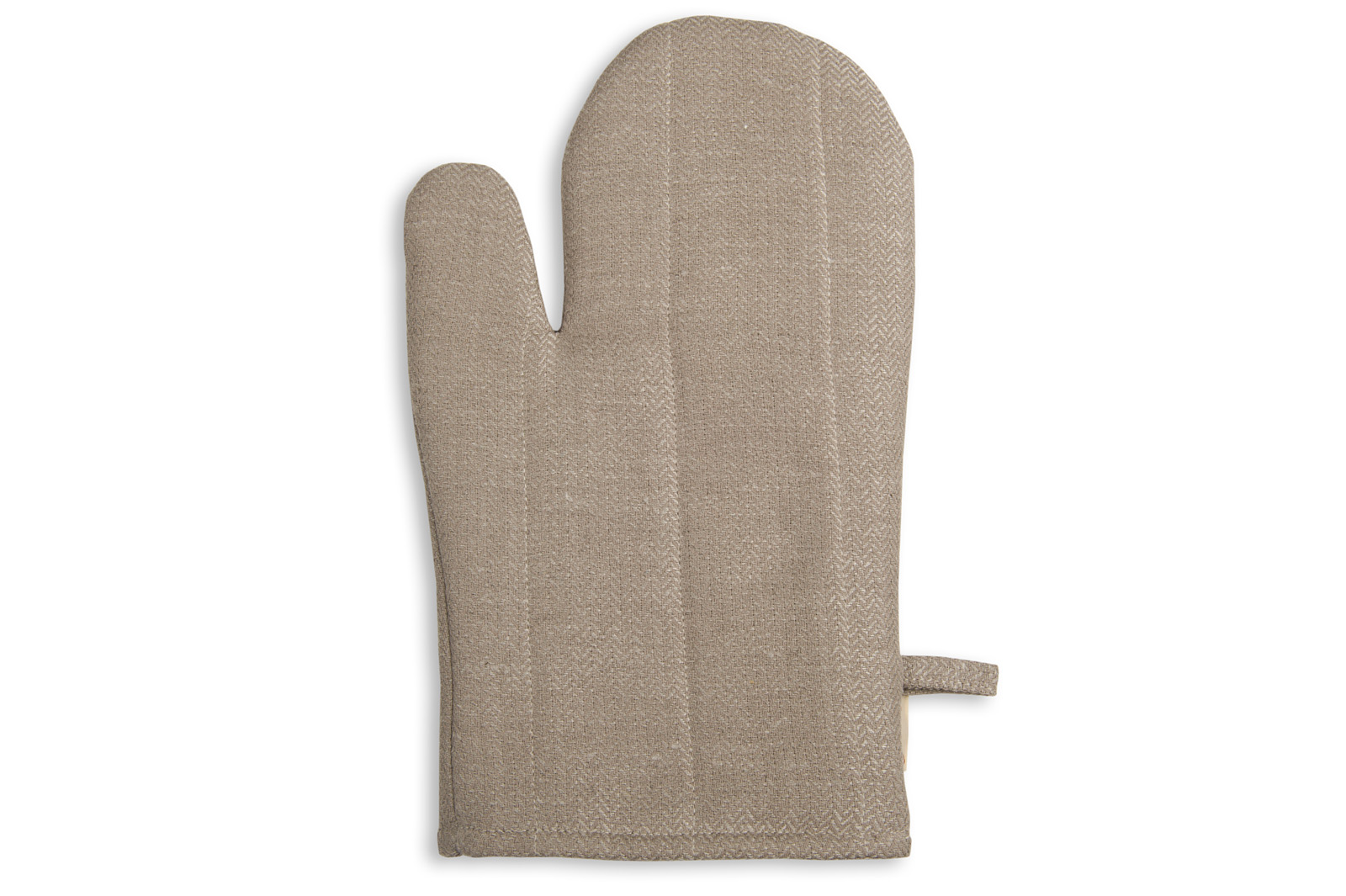 Ofenhandschuh, aus grauem Leinen-Baumwollstoff, in kleinem Fischgratmuster gewebt, angefertigt. Hitzefeste Wattierung innen lässt Sie gefahrlos in der Küche arbeiten. Die Aufhängeschlaufe ist speziell angenäht, damit Sie den unentbehrlichen Helfer immer bei der Hand haben könnten. Ein schönes Set mit passendem Topflappen!