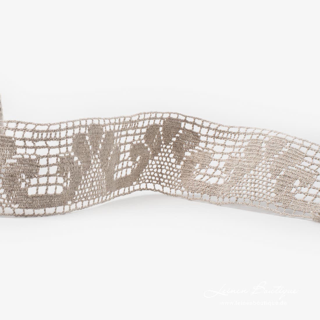 Leinenspitze naturgrau (aus ungefärbtem, bräunlichgrauem Garn). Spitze / Borte mit Blumenmuster ist ideal zum Dekorieren von verschiedenen Artikeln: Bekleidung, Bettwäsche, Gardinen, Tischdecken.