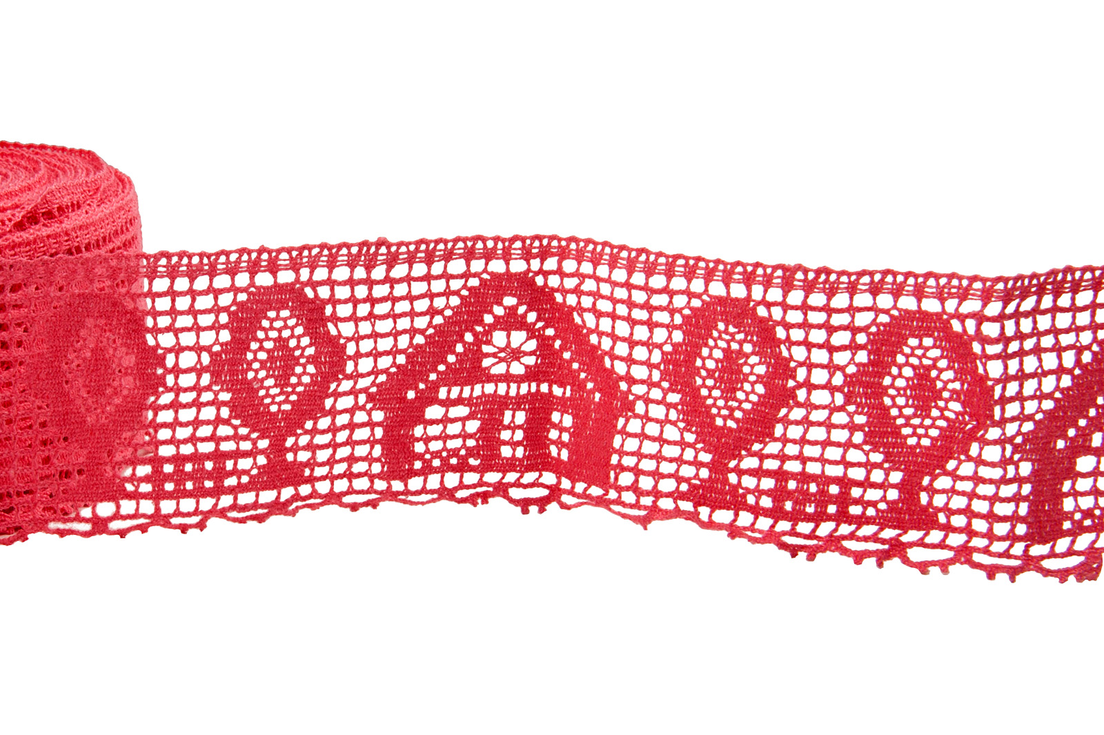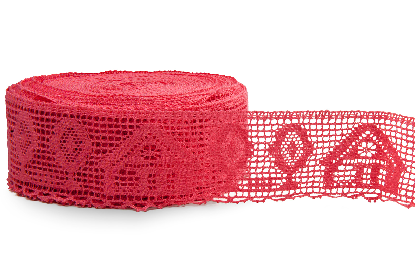 Intensiv rosa Leinenspitze mit Häuschen- und Bäumemuster. Dekorieren Sie Gardinen, Tischdecken, Bett- und Kissenbezüge, Bekleidung, wenn Sie dem Genähten etwas Verspieltes verleihen möchten.