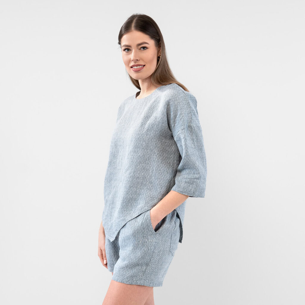 - Produktmodell: lockere Passform, hüftlang, 3/4-Ärmel, Rundhalsausschnitt, asymmetrischer Saum