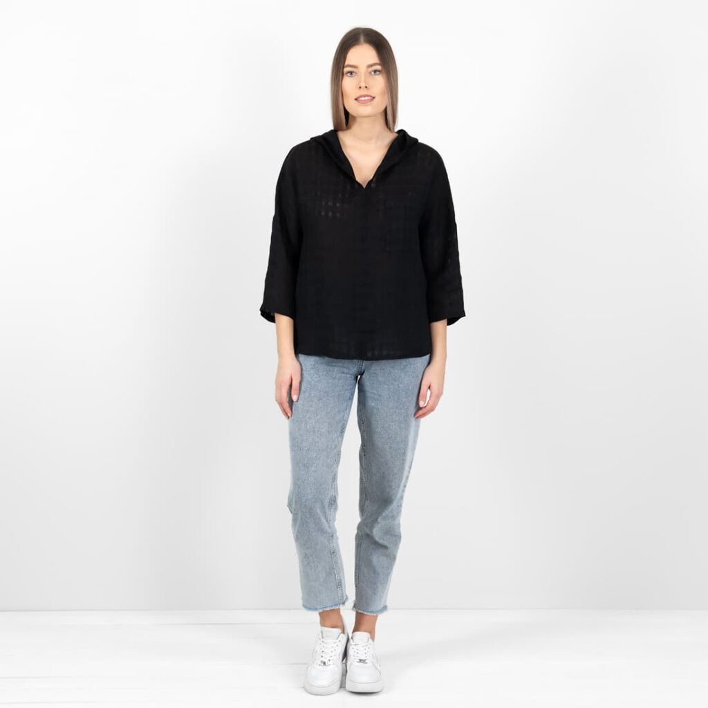 - Modell: lockere gerade hüftenlange Silhouette, 3/4 Ärmel, Kapuze