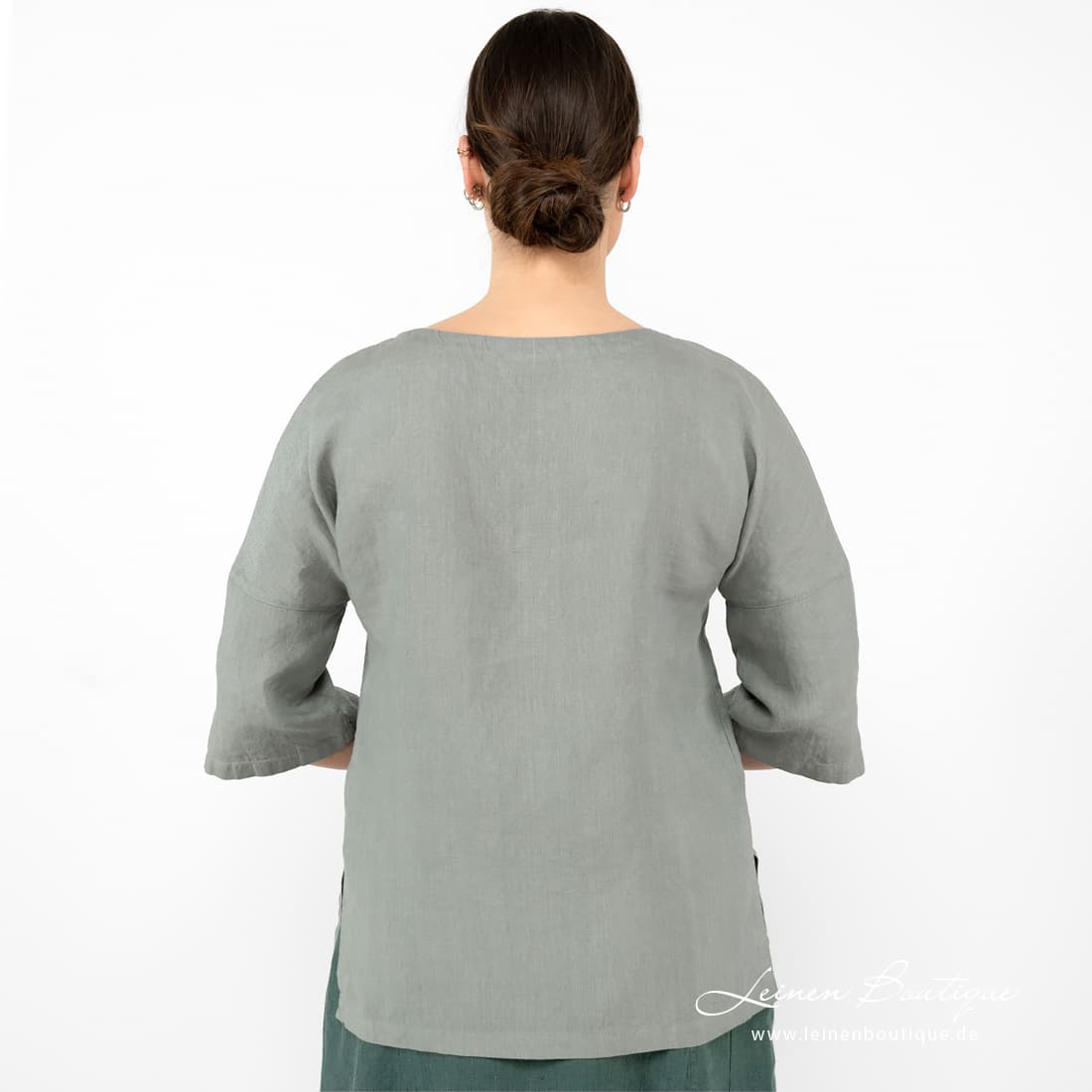 • Leinenbluse grüngrau mit seitlichen Schlitzen und einem Rundhalsausschnitt