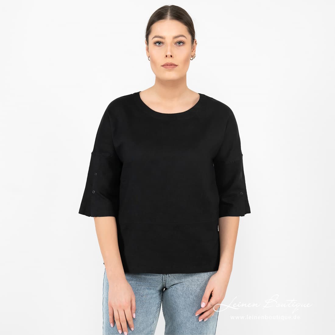 • Leinenbluse schwarz mit 3/4 Ärmeln mit Druckknöpfen