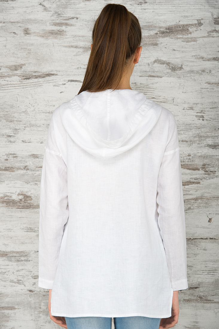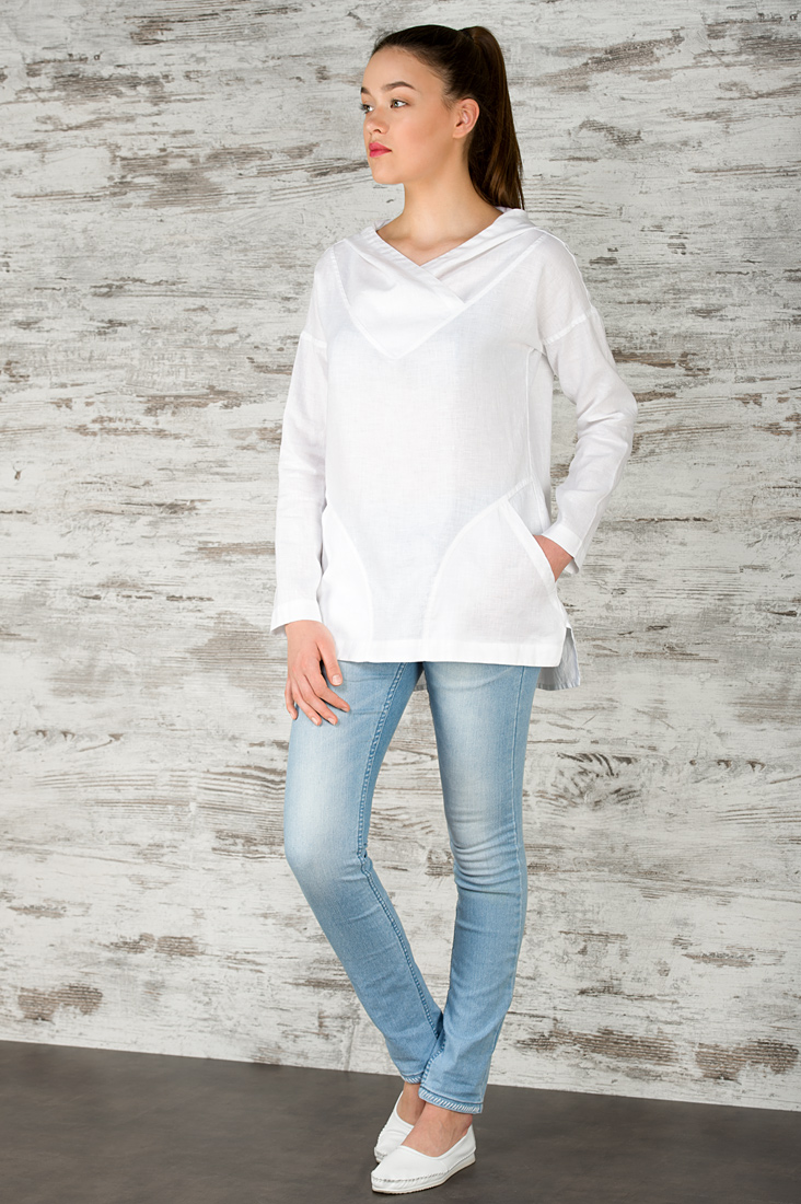 Bluse aus schneeweißem Reinleinen. Für aktive Freizeit, wenn Sie schön aussehen und sich bequem fühlen möchten. Wunderschöne Kombination von dem Sommer, Reinleinen, Fahradfahren und Spaziergang am Meer.