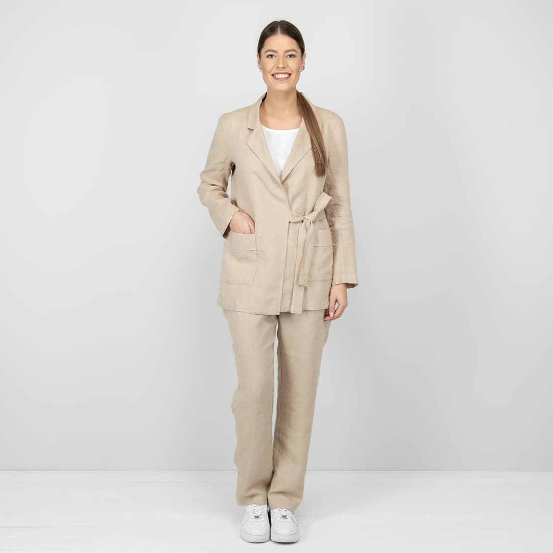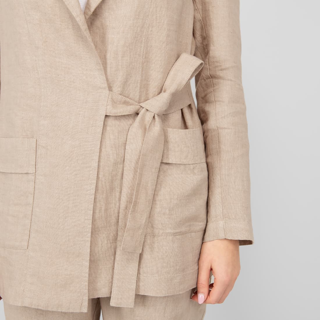• Leinenjacke taupe mit breitem Bindegürtel an der linken Seite