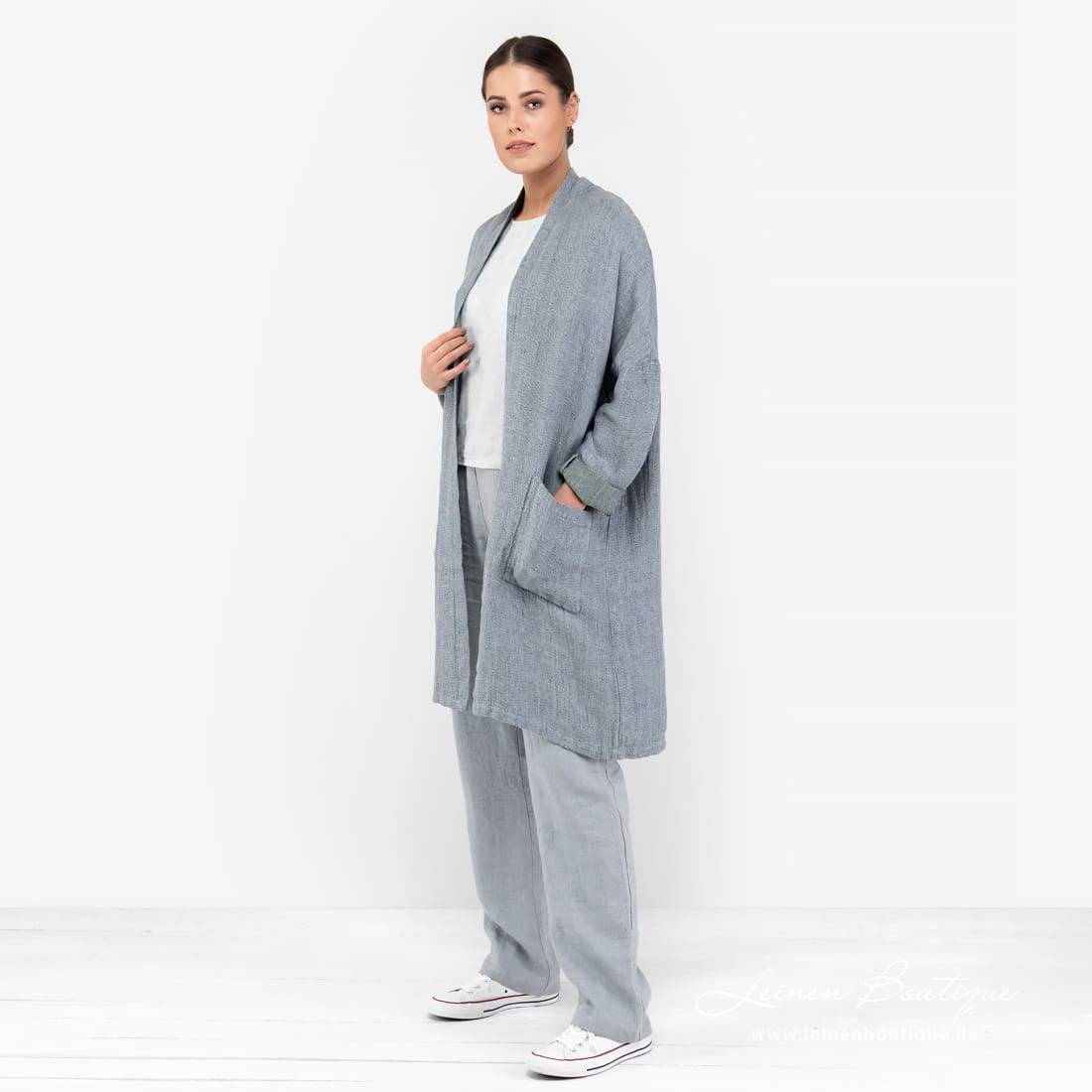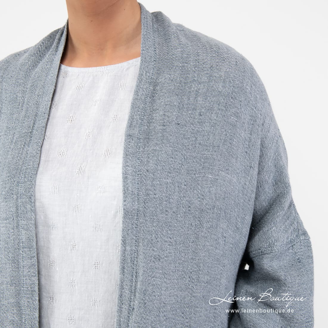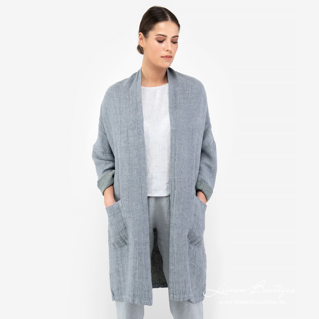 Cardigan aus ziemlich dickem Reinleinen, in dem wir blaugraues, altgrünes und bläulichgraues Garn zusammen gewebt haben. Das bequeme, lässige Kleidungsstück ist ideal für einen kühlen Sommerabend: flaumiges Leinen wärmt gemütlich. In Freizeitlook können Sie den Cardigan zur Jeanshose, einem knielangen Rock, schlichter Bluse kombinieren.