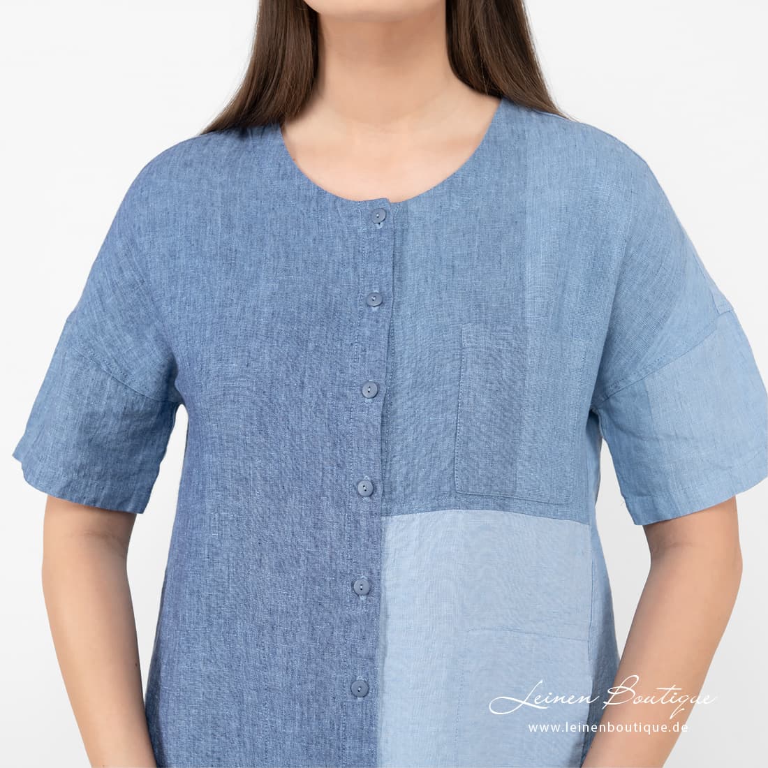- Details: kurze Ärmel, Rundhalsausschnitt, Knopfverschluss, eine Brusttasche, Taschen