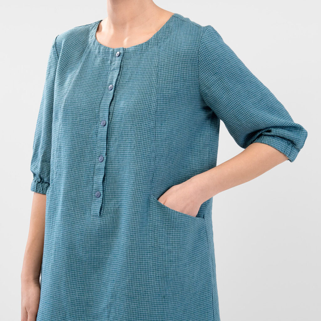 - Details: Rundhalsausschnitt mit kurzer Knopfleiste, zwei Seitentaschen