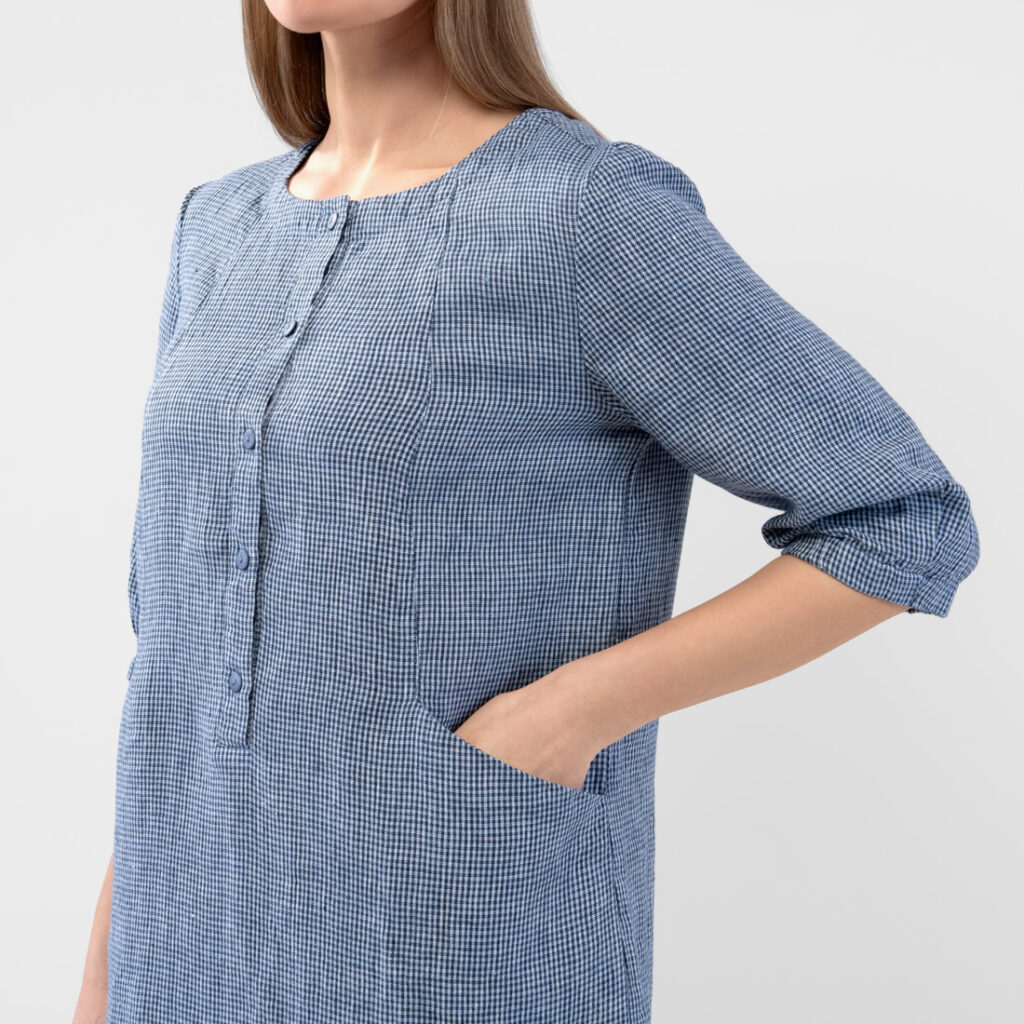 - Details: Rundhalsausschnitt mit kurzer Knopfleiste, zwei Seitentaschen