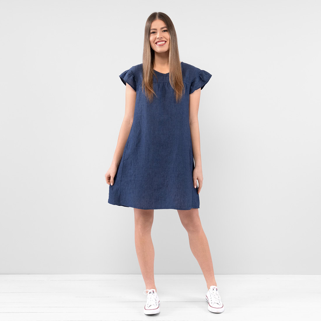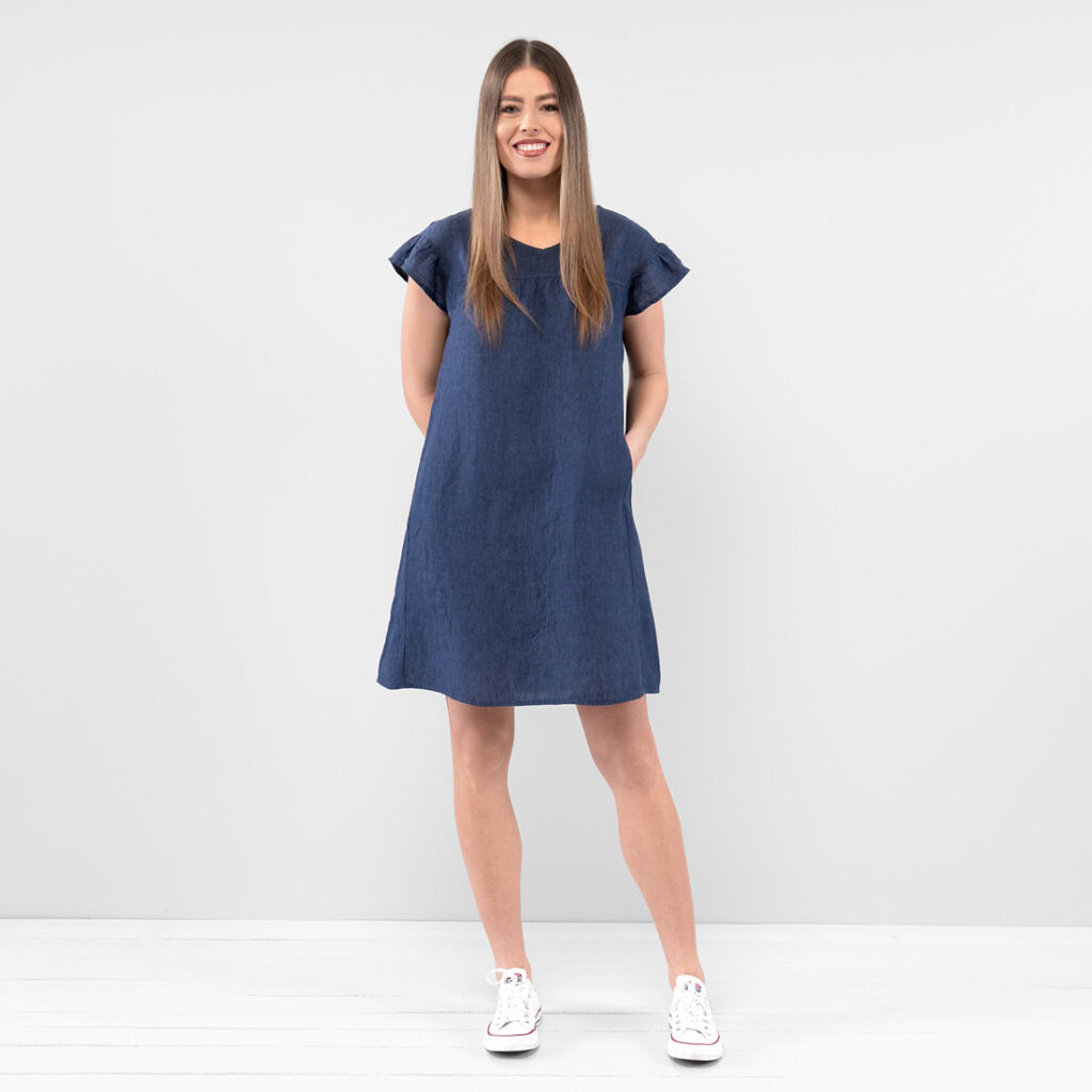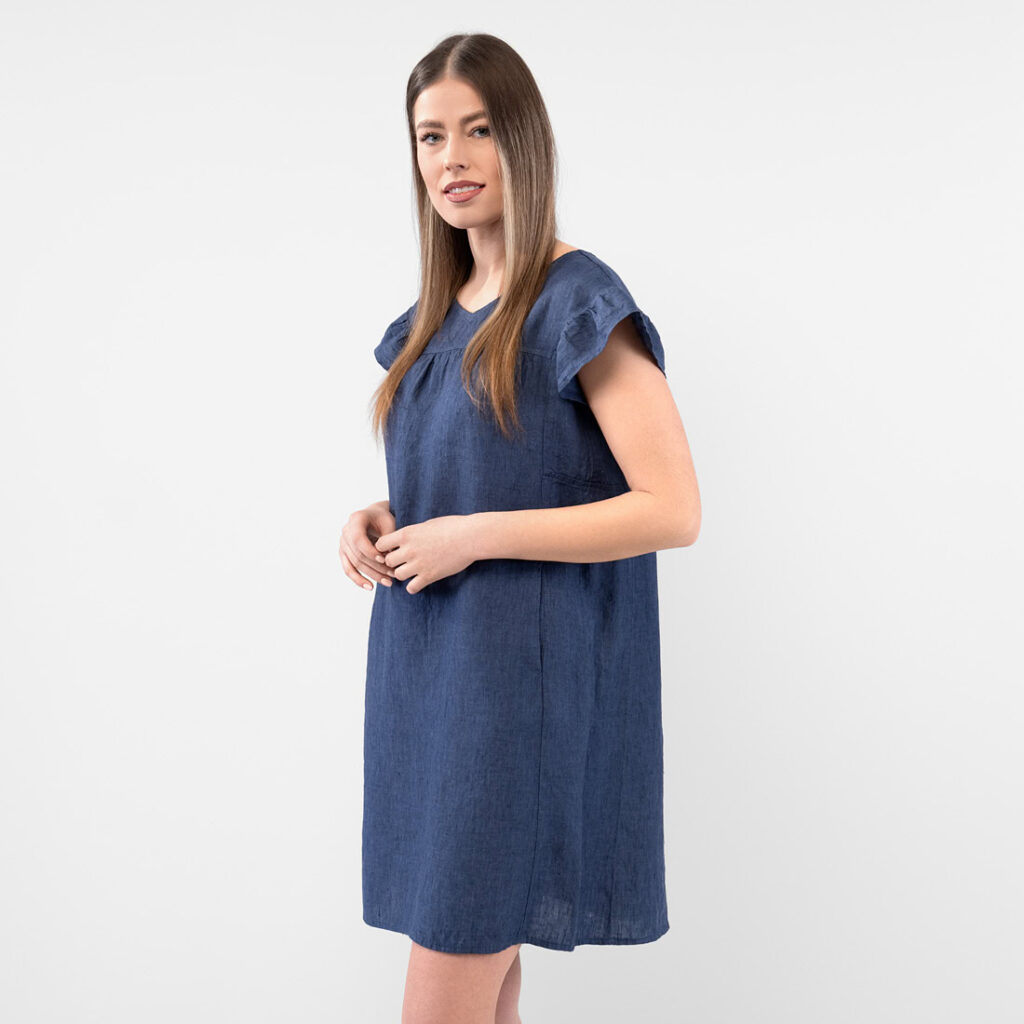 - Produktmodell: gerade Silhouette, lockere Passform, Länge oberhalb des Knies, kurze, geraffte Flatterärmel
