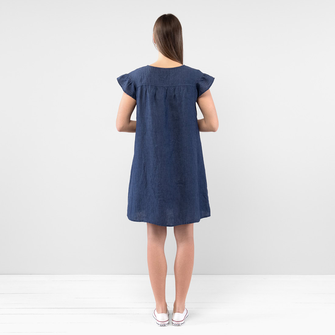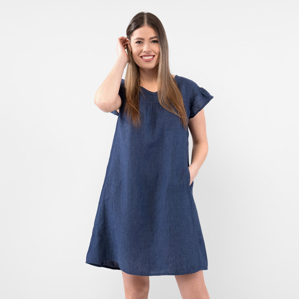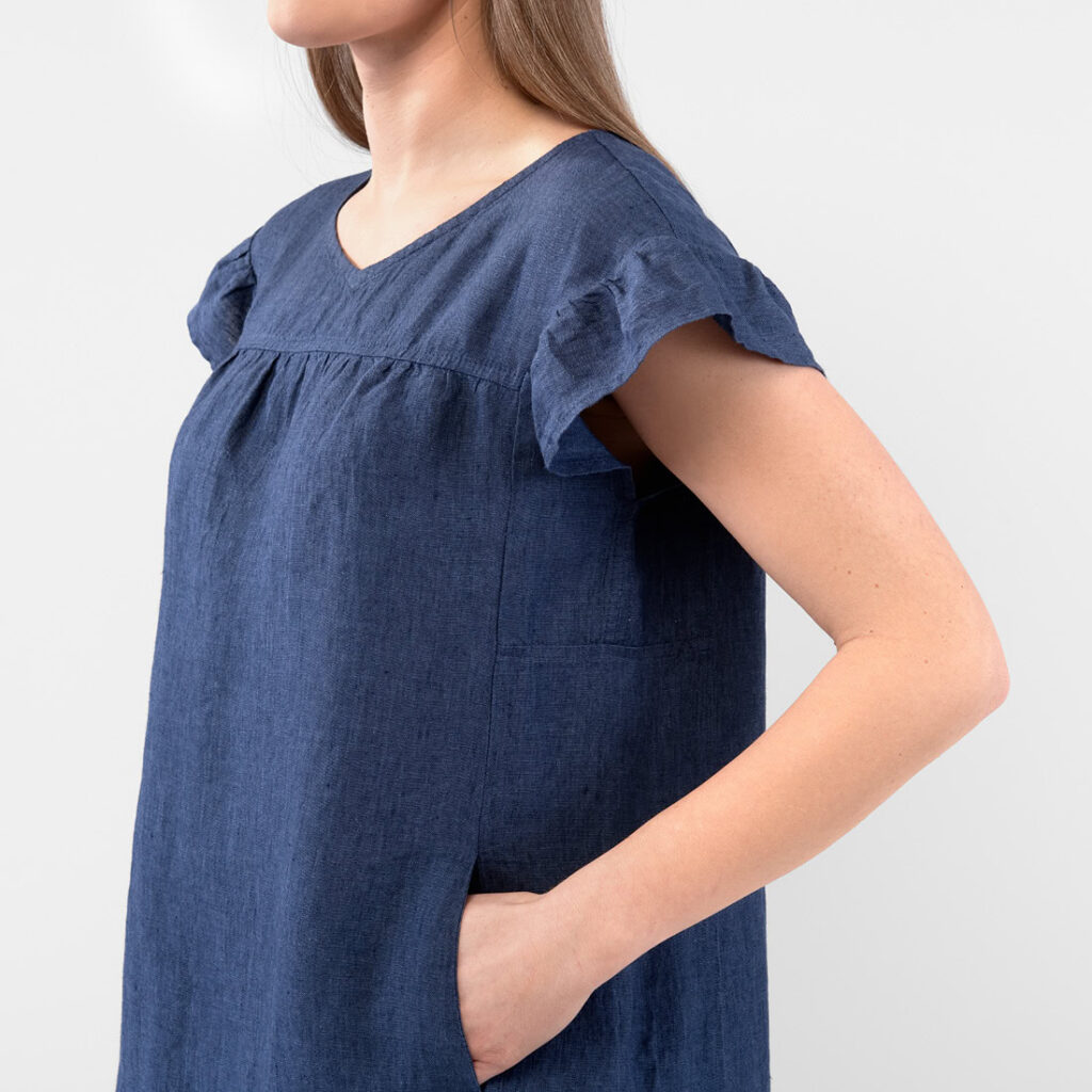 - Produktmodell: gerade Silhouette, lockere Passform, Länge oberhalb des Knies, kurze, geraffte Flatterärmel