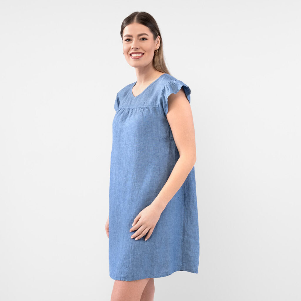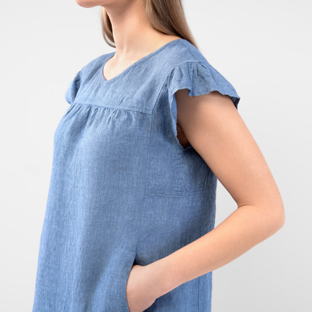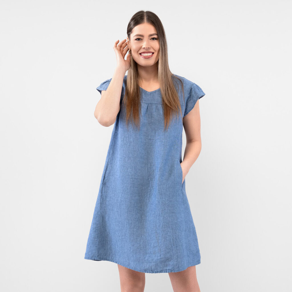 - Produktmodell: gerade Silhouette, lockere Passform, Länge oberhalb des Knies, kurze, geraffte Flatterärmel