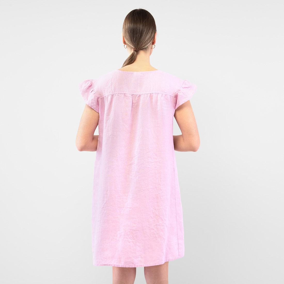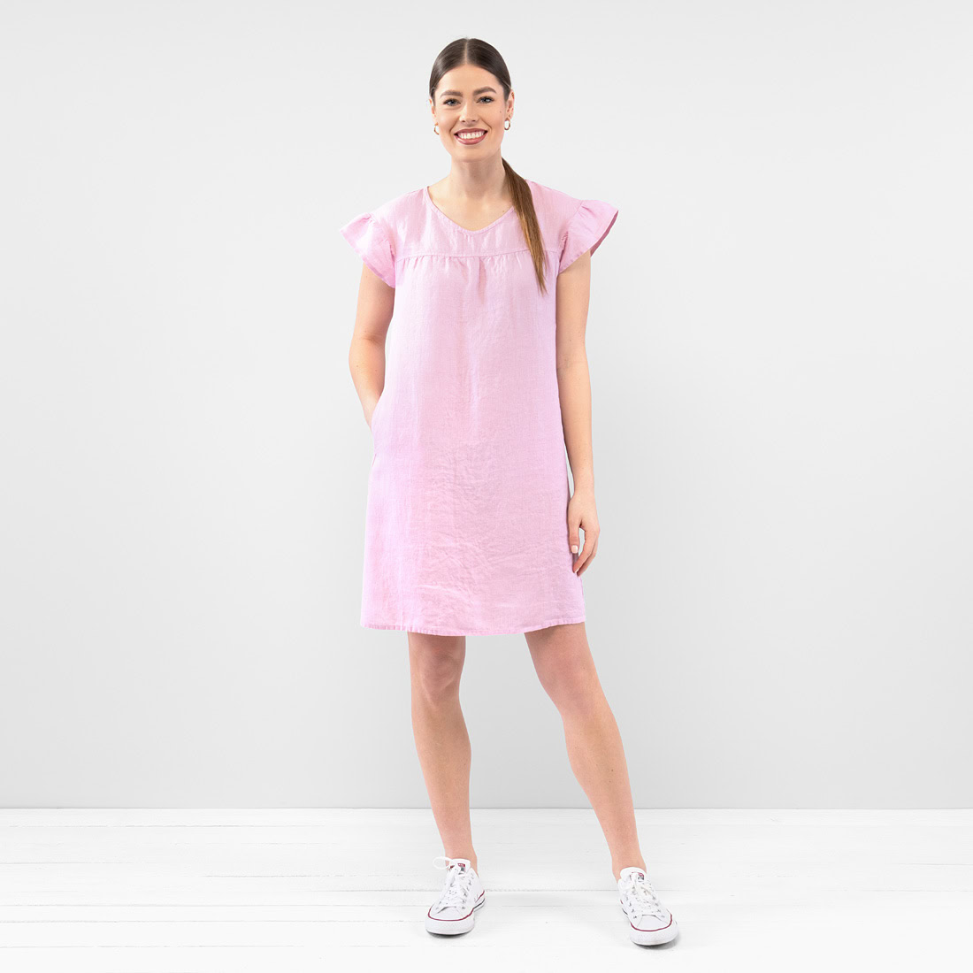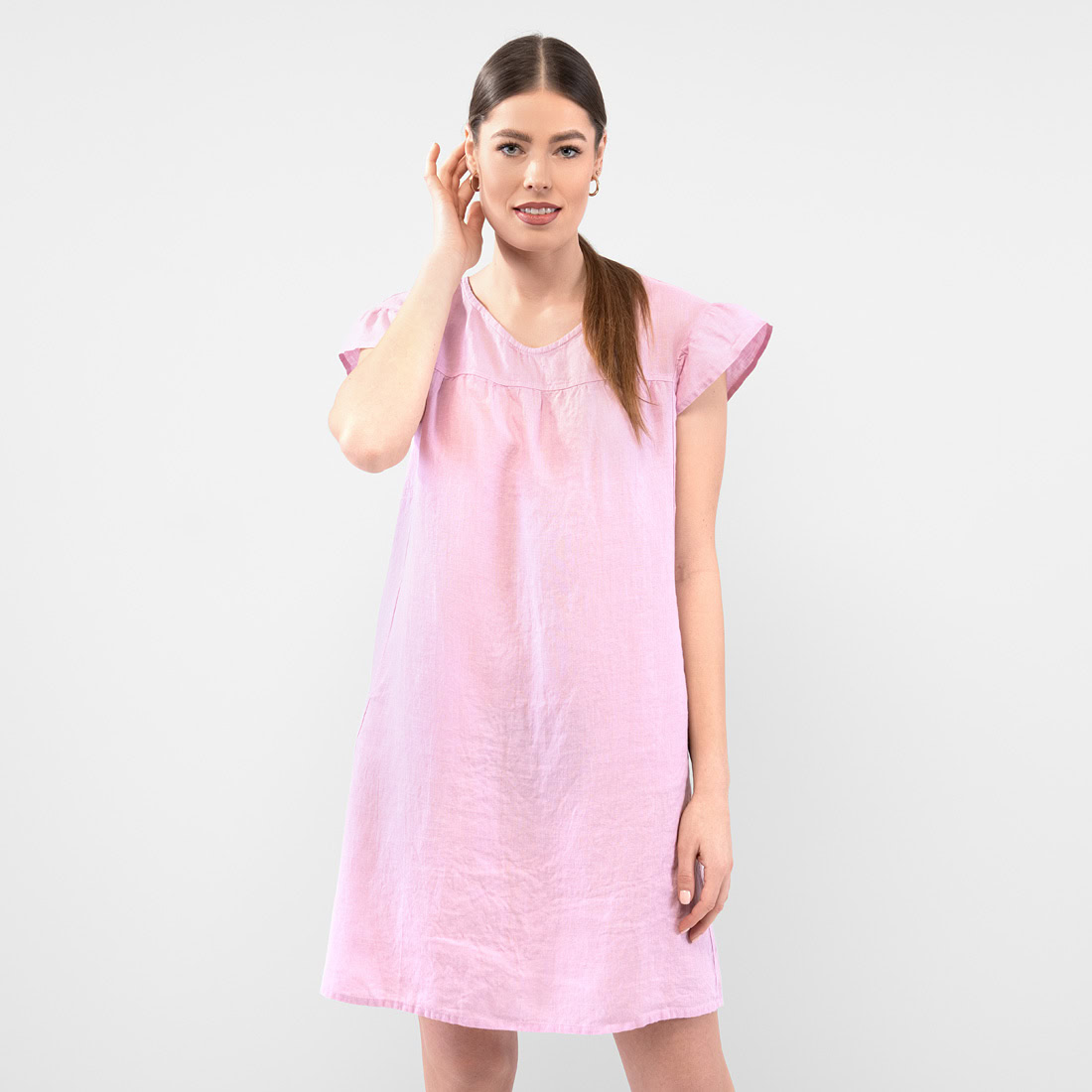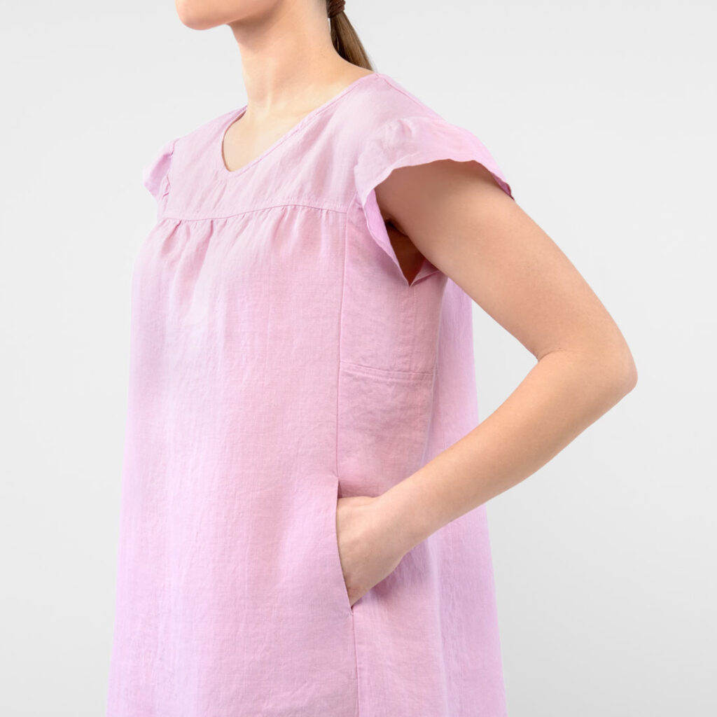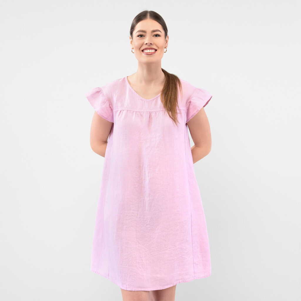 - Produktmodell: gerade Silhouette, lockere Passform, Länge oberhalb des Knies, kurze, geraffte Flatterärmel