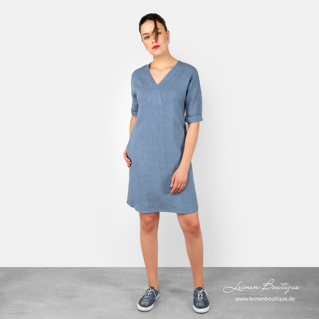 Blaues Leinenkleid aus einem Melange-Stoff, in dem hell- und graublaues Leinengarn zusammengewebt wurde. Die Schönheit der Einfachheit und Natürlichkeit, das Tragekomfort macht sehr schnell das Kleid zu Ihrem Lieblingskleid.