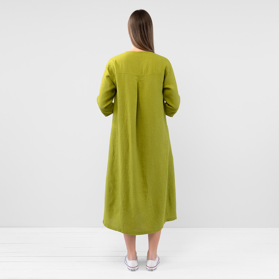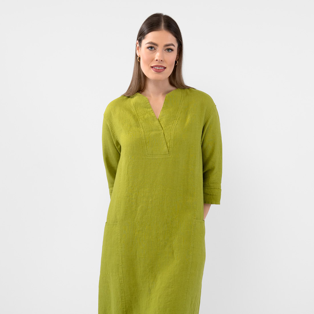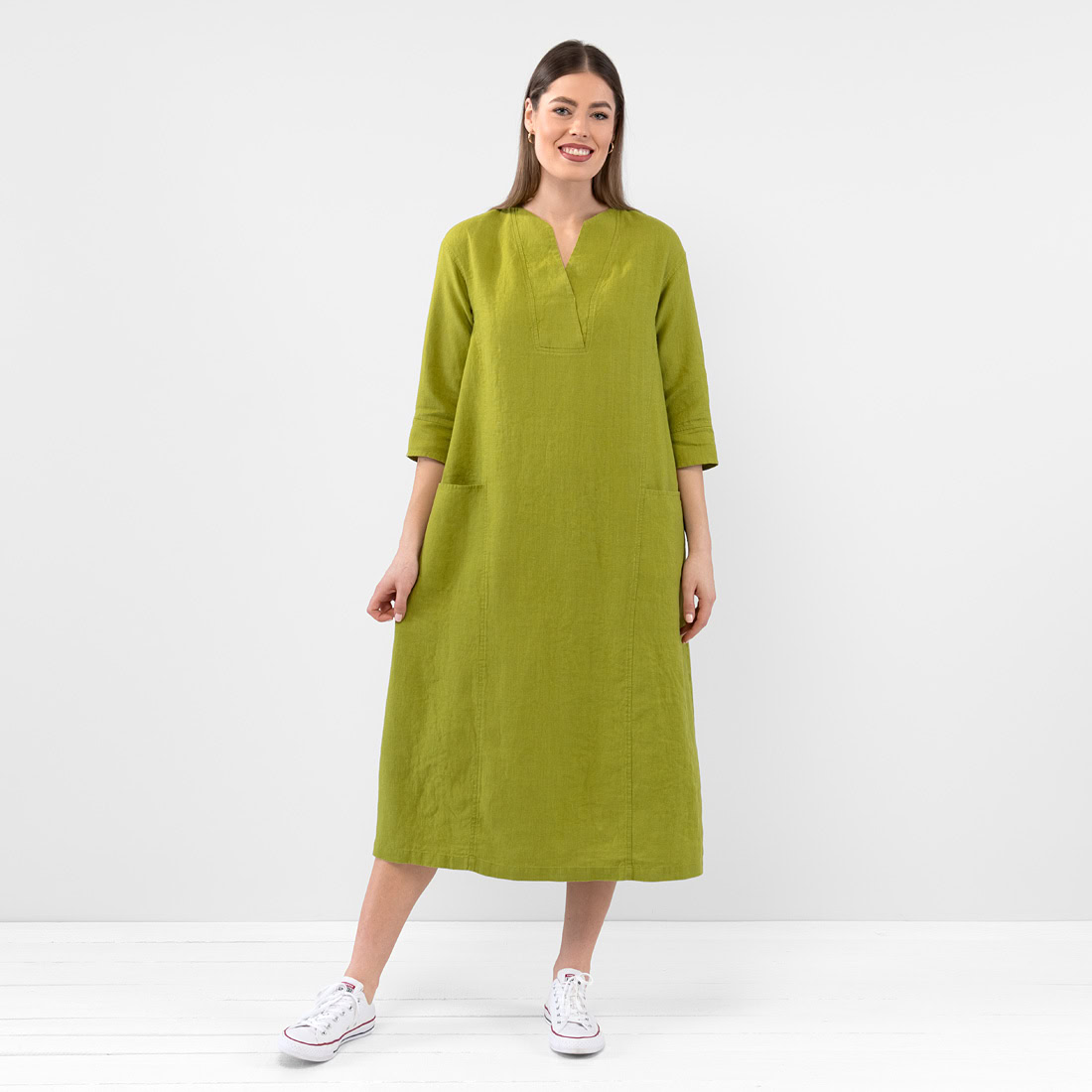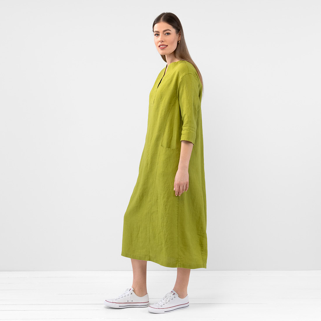 - Produktmodell: A-Linien-Silhouette, lockere Passform, Maxilänge, 3/4 Ärmel