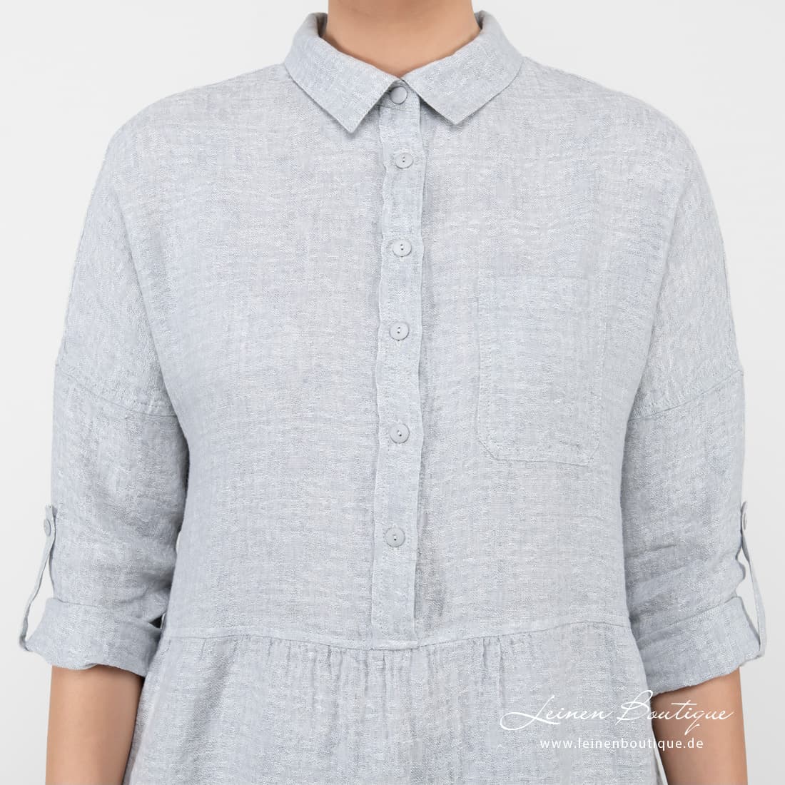 - Details: Knopfverschluss, Hemdkragen, Brusttasche links, 3/4 Ärmel mit Knopfriegel, feine Raffung an der Taille, Taschen in Seitennähten
