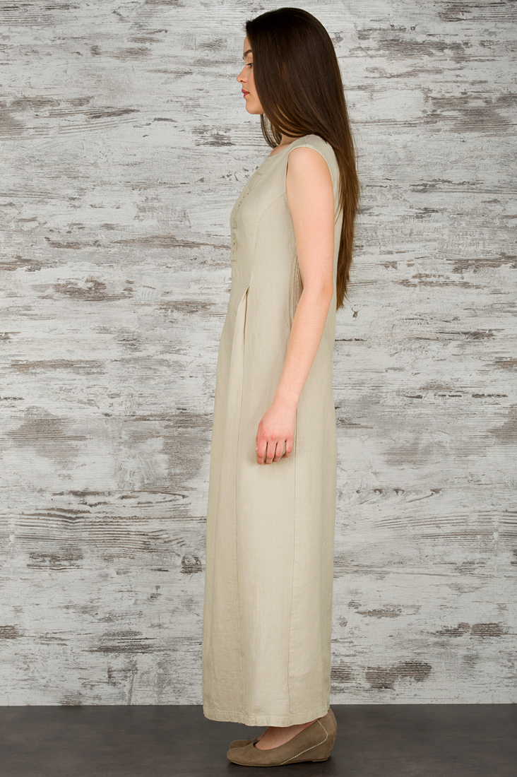 Beiges (helles gelbbräunliches) reinleinen Kleid. Mit Sonnenbräune, bequemen Sandaletten und langen Spaziergängen kombinierbar.