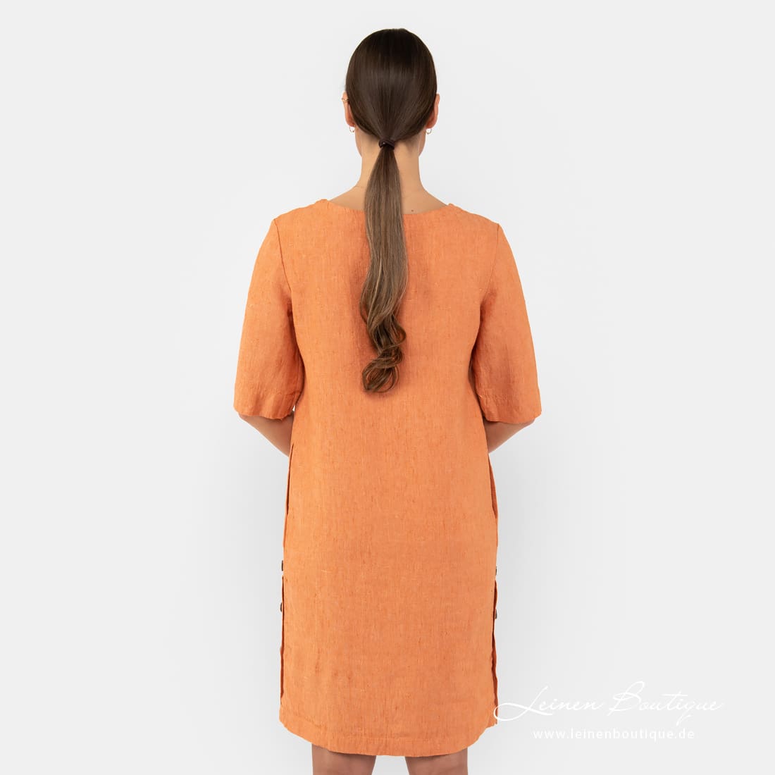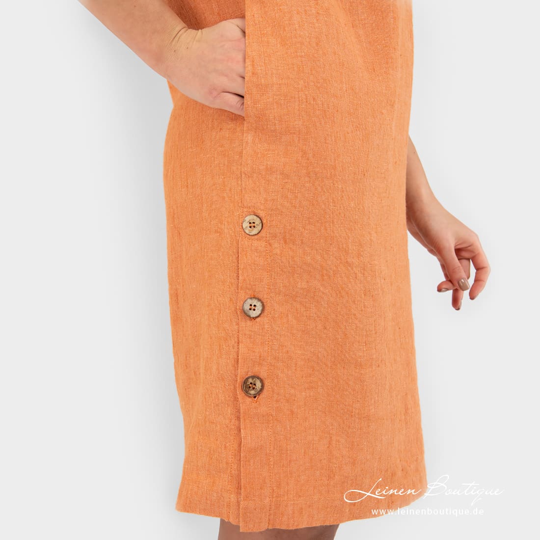 MALVINA Kleid ist aus einem Melange-Reinleinen angefertigt worden. In dem Stoff haben wir dunkelorange und puderfarbiges (rosabraunes) Garn zusammengewebt. Warme Farbe ist besonders schön für den Sommer. Ziehen Sie das Kleidungsstück an und genießen das sanfte Leinen an der Haut.