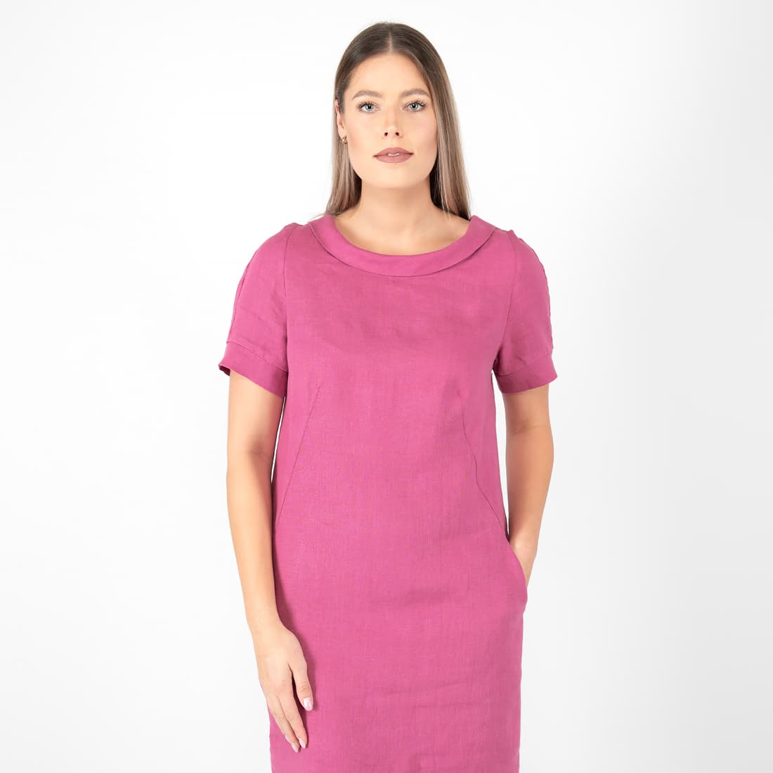 • Leinenkleid beerenrot mit Taschen in den Schrägnähten vorne