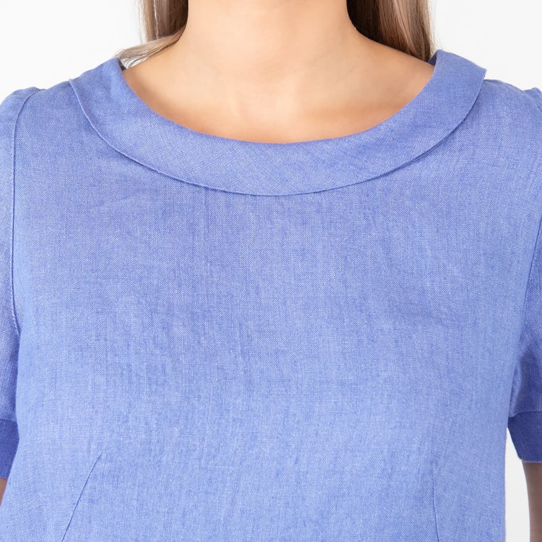 • Leinenkleid blau mit Rundhalsausschnitt und Reverskragen
