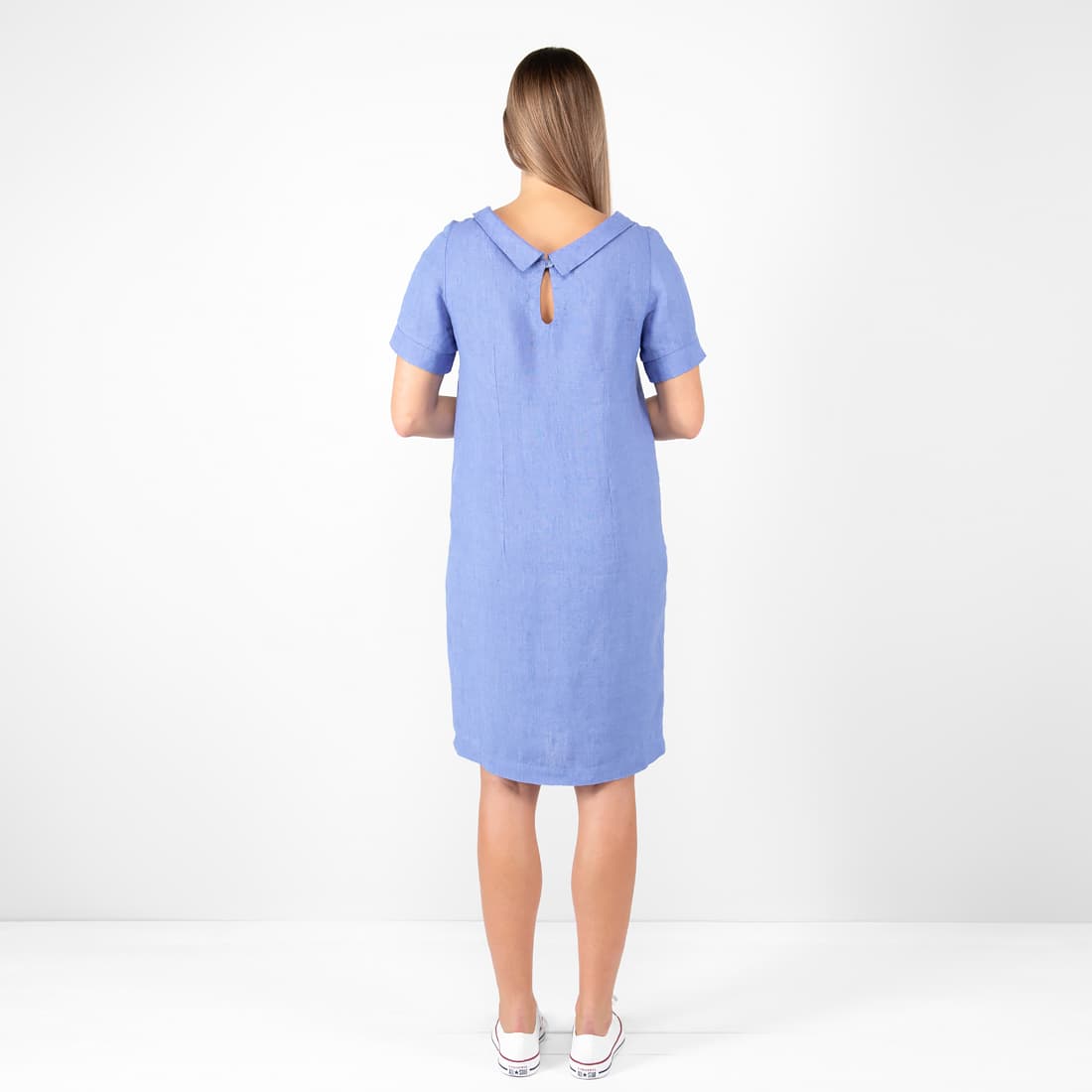 • Leinenkleid blau hat breiten V-Form Ausschnitt und Schlüssellochausschnitt mit kleinem Knopf am Rücken