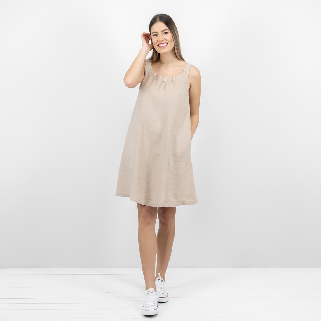 • Leinenkleid taupe mit feiner Raffung am Ausschnitt hinten