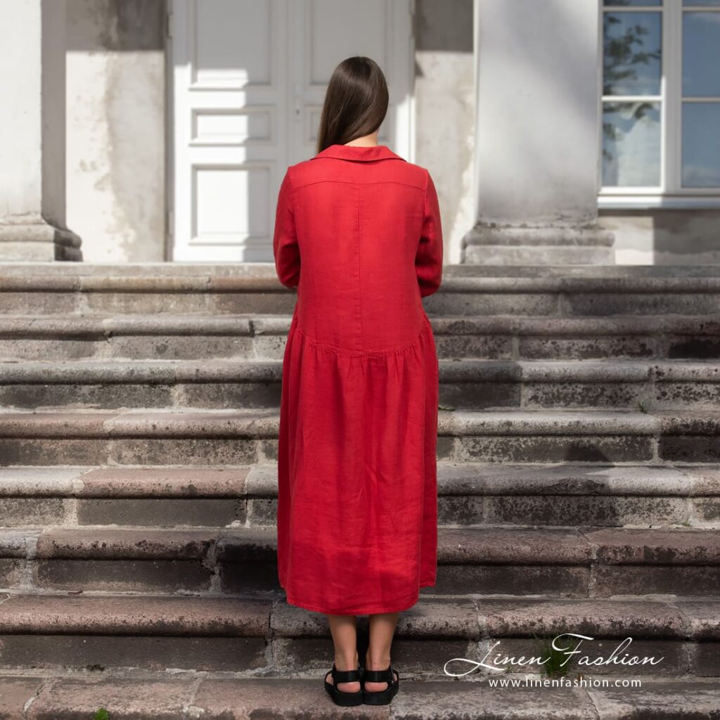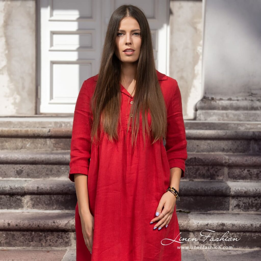 - Details: Hemdkragen, kurze Knopfleiste vorne, feine Raffung unter der Brust, Taschen