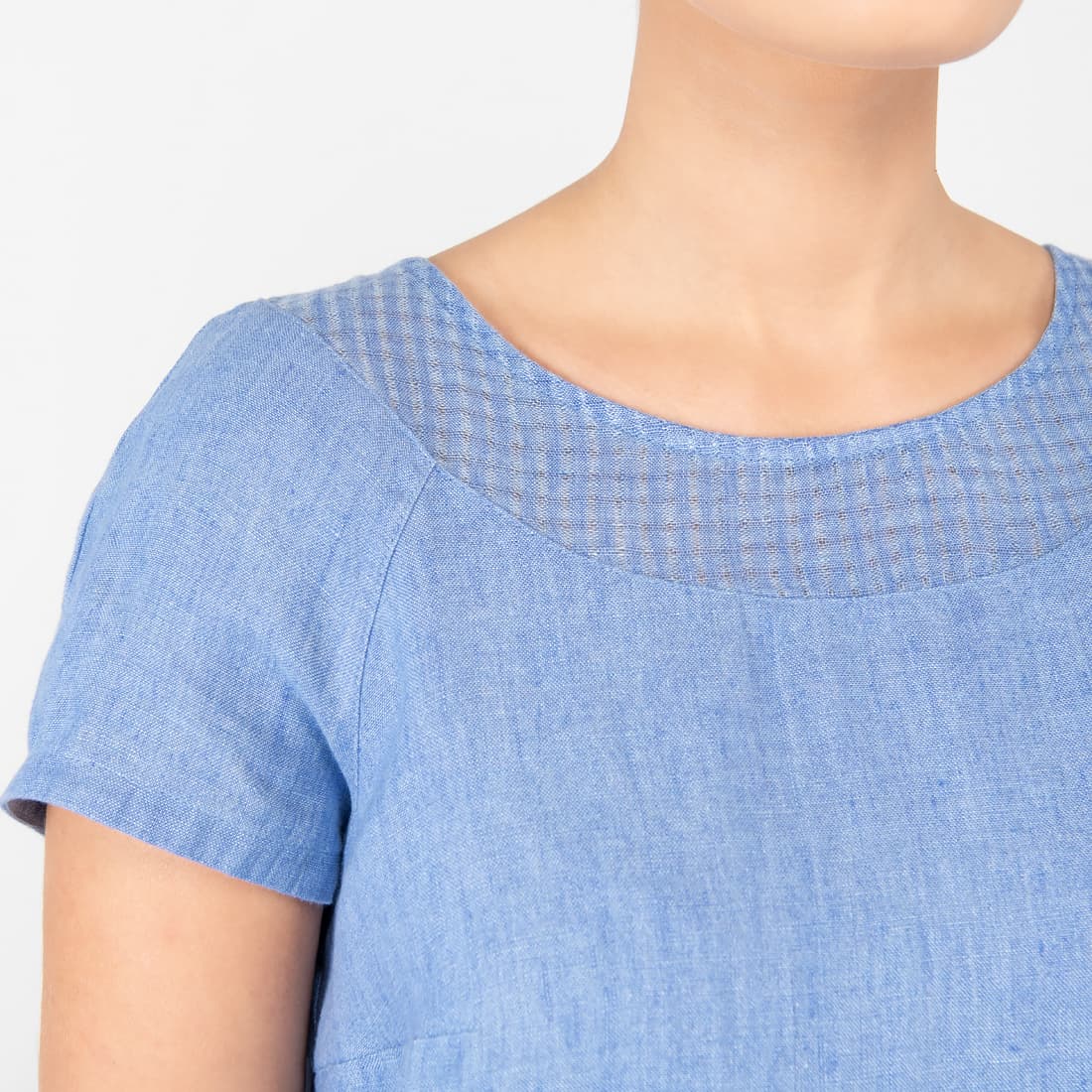 • Leinenkleid blau mit einem Detail aus offen gewebtem kariertem Stoff rundum des Ausschnitts