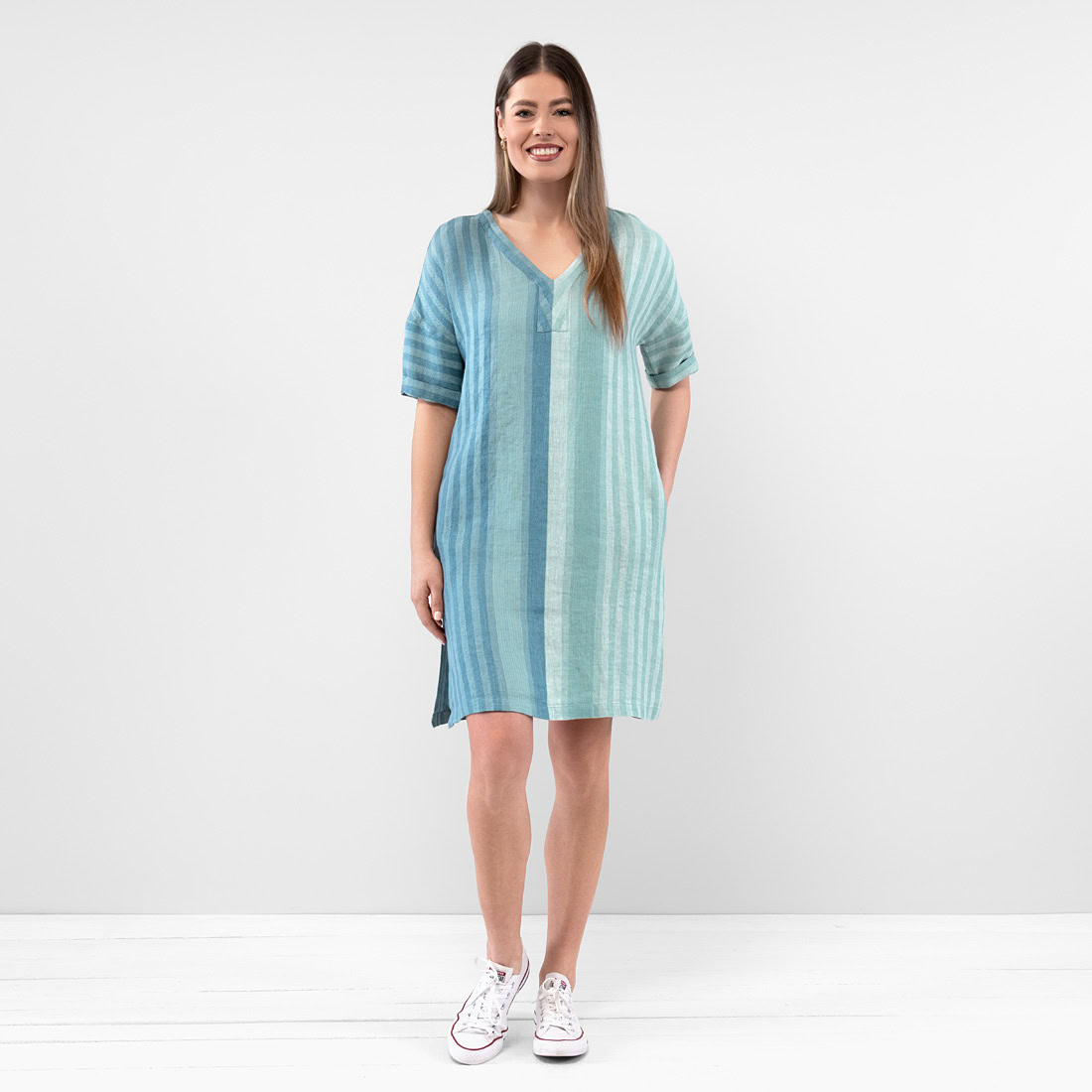 - Produktmodell: gerade Silhouette, lockere Passform, Länge oberhalb des Knies, ellbogenlange Ärmel