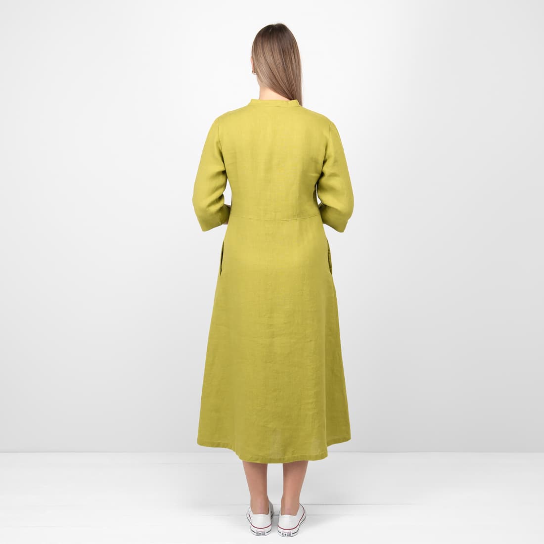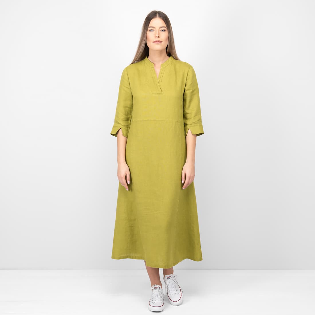 • Leinenkleid apfelgrün wadenlang, in einem A-Schnitt