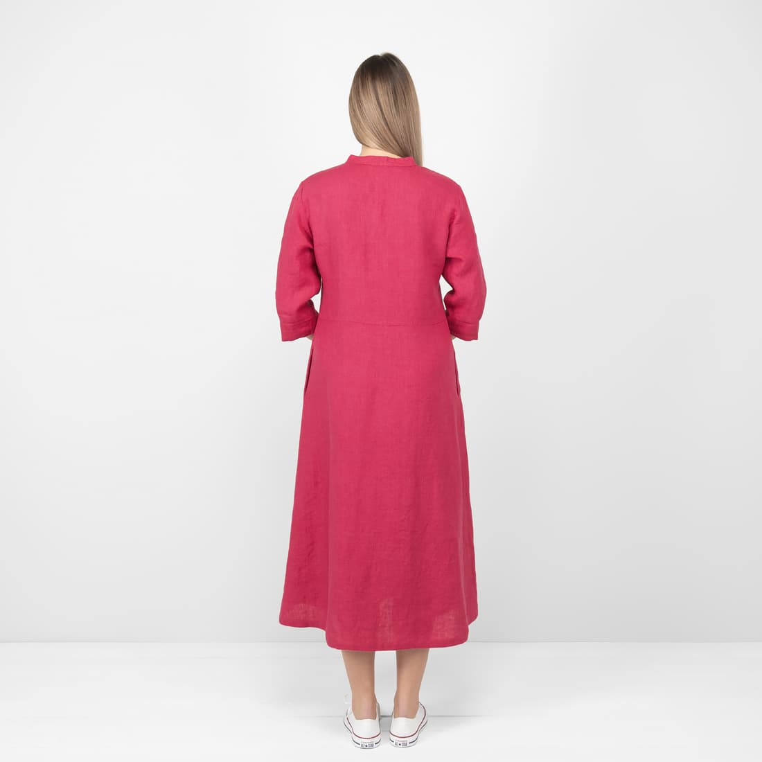 • Leinenkleid rot mit einem Stehkragen und V-Ausschnitt, mit feinen Falten dekoriert
