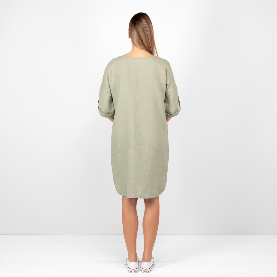 • Leinenkleid altgrün mit abgerundetem Saum, seitlichen Schlitzen