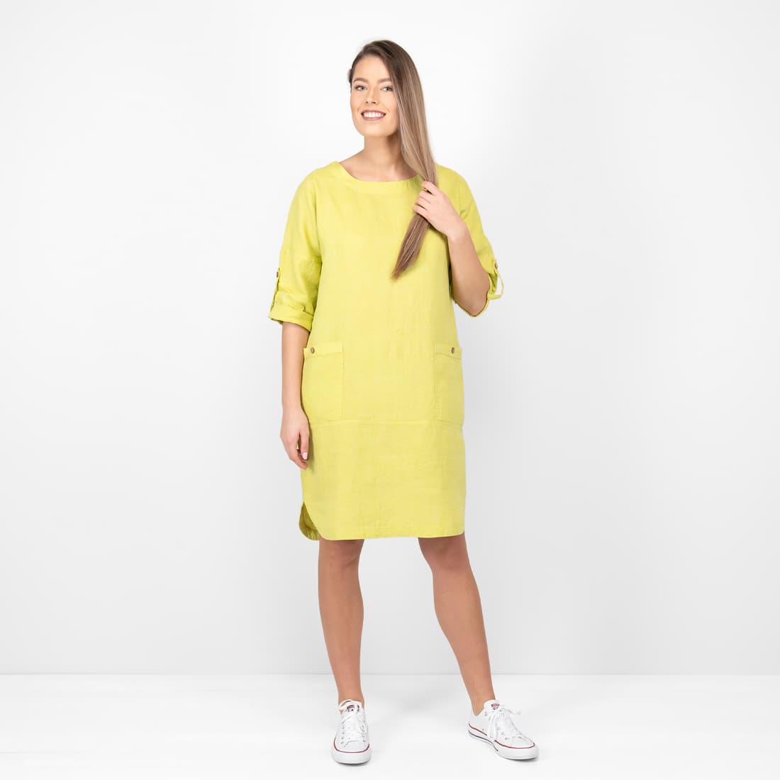 • Leinenkleid gelbgrün mit großen Taschen vorne