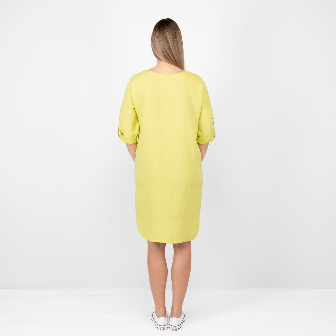 • Leinenkleid gelbgrün mit Rundhalsausschnitt, 3/4 Ärmeln mit Knopfriegeln
