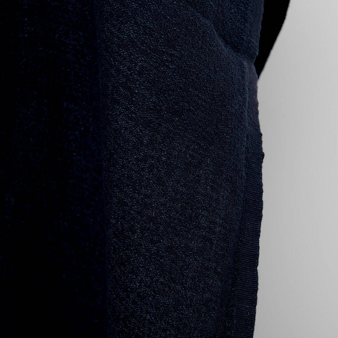 Jacquard-Stoff aus dunkelblauen und schwarzen Leinen- und Baumwollgarnen. Kreppbindung (unregelmäßige Bindung) schafft eine schöne Buntheit des Stoffes. Unglatte Oberfläche wurde betont und die Weichheit hat der Stoff dank industrielles Waschens bekommen. Der Stoff läuft beim Waschen nicht mehr ein.