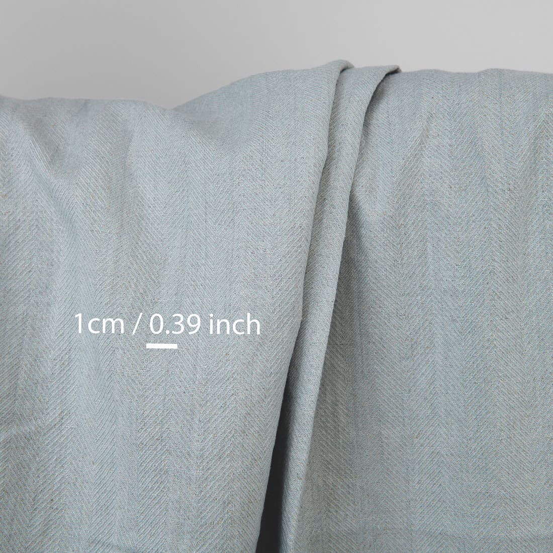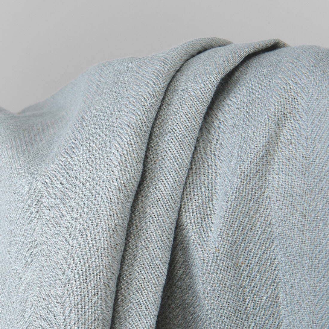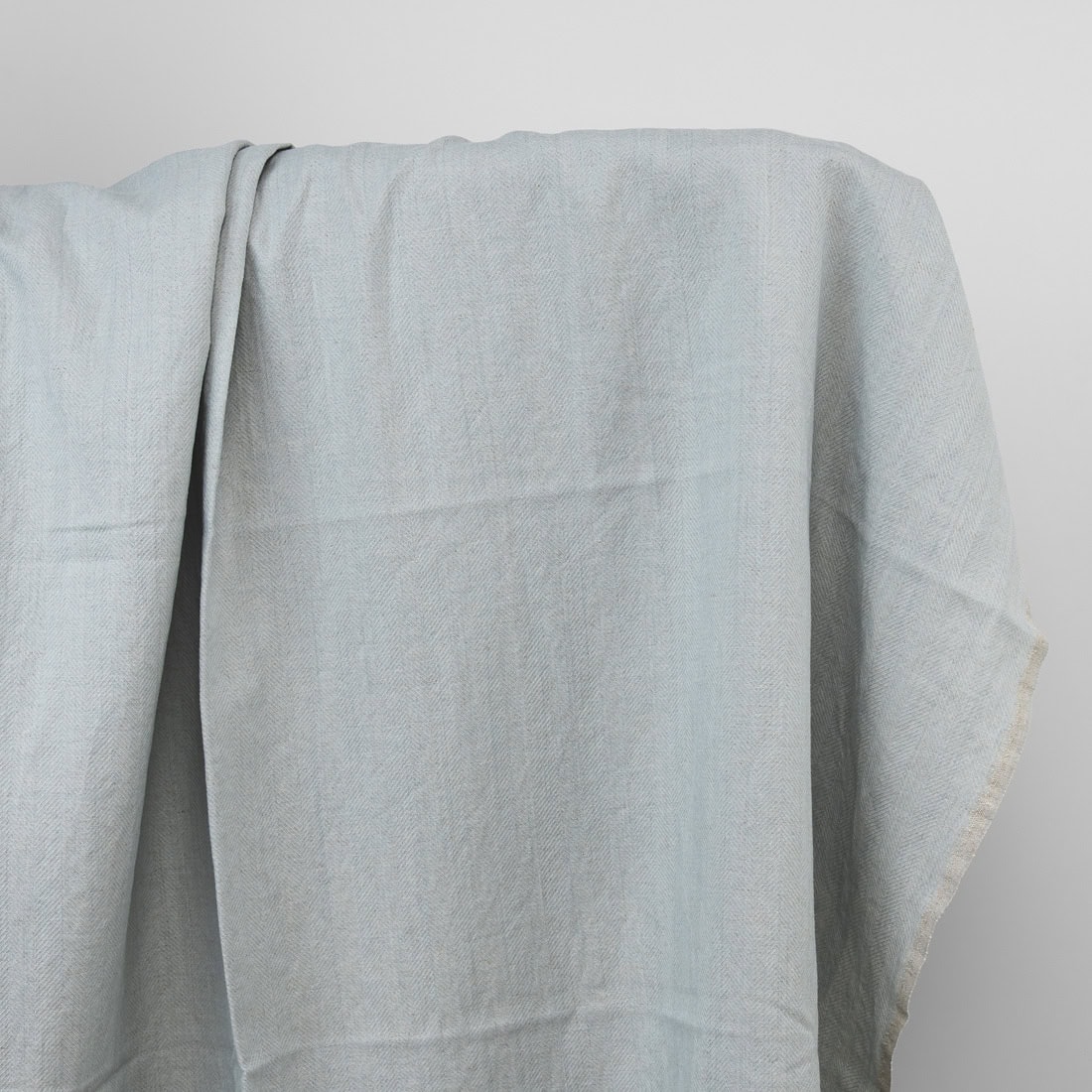 Heller Leinen-Baumwollstoff, in Fischgratbindung aus naturgrauen (ungefärbten) und hellen blaugrünen Garnen gewebt. Mitteldick, ziemlich schwer, dicht gewebt, aber weich, hautsympathisch, angenehm zu tragen, weil industriell vorgewaschen. Läuft beim Waschen nicht mehr ein.