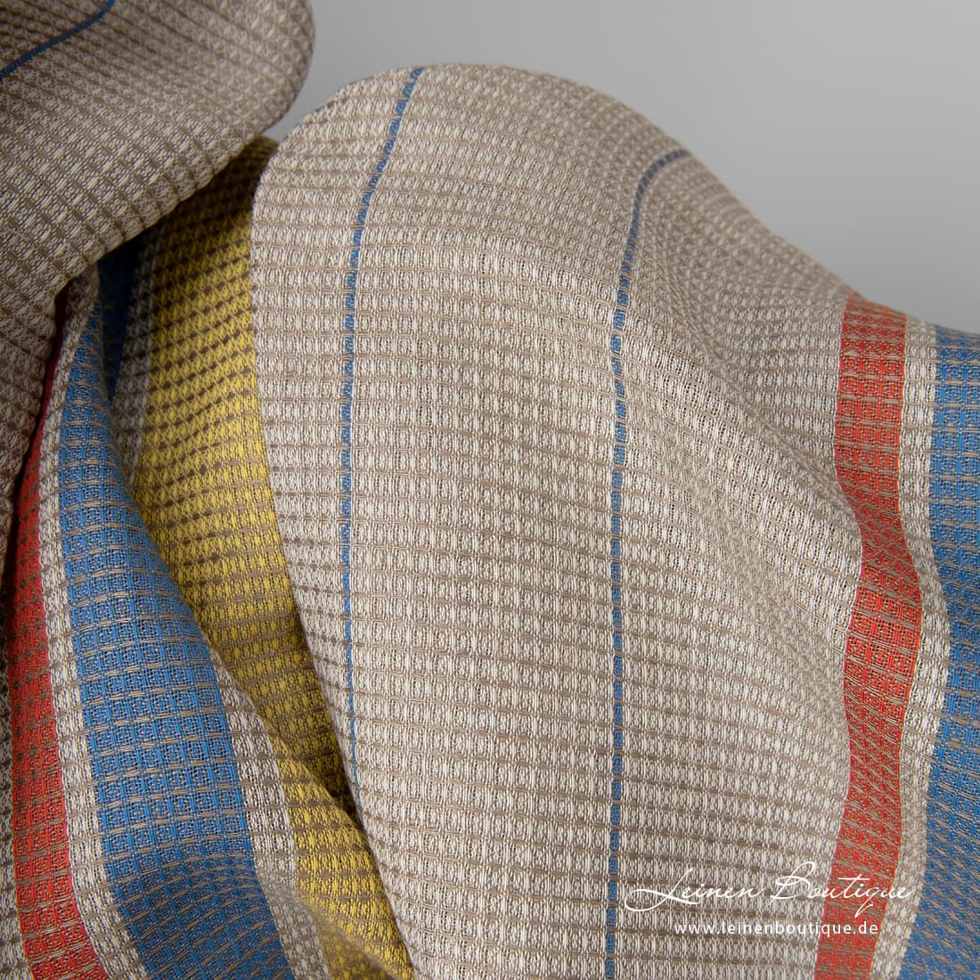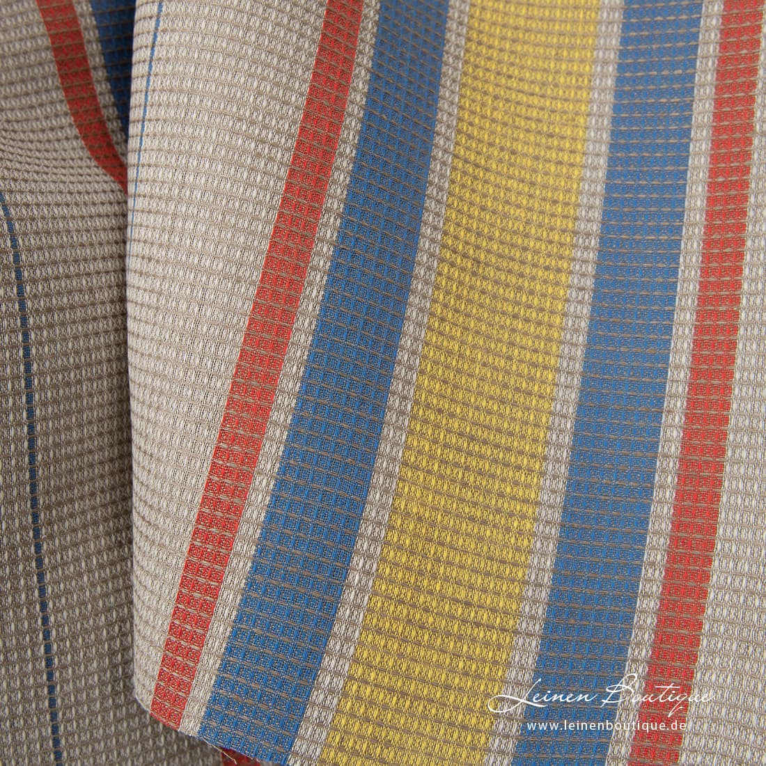 - Farbe: weißes, gelbes, blaues, rotes und dunkelbeiges Garn zusammengewebt