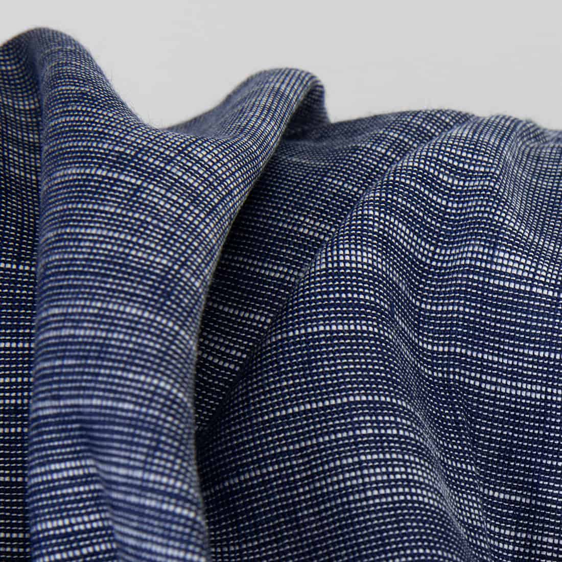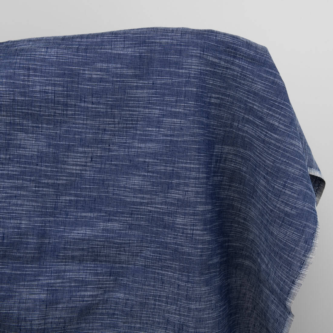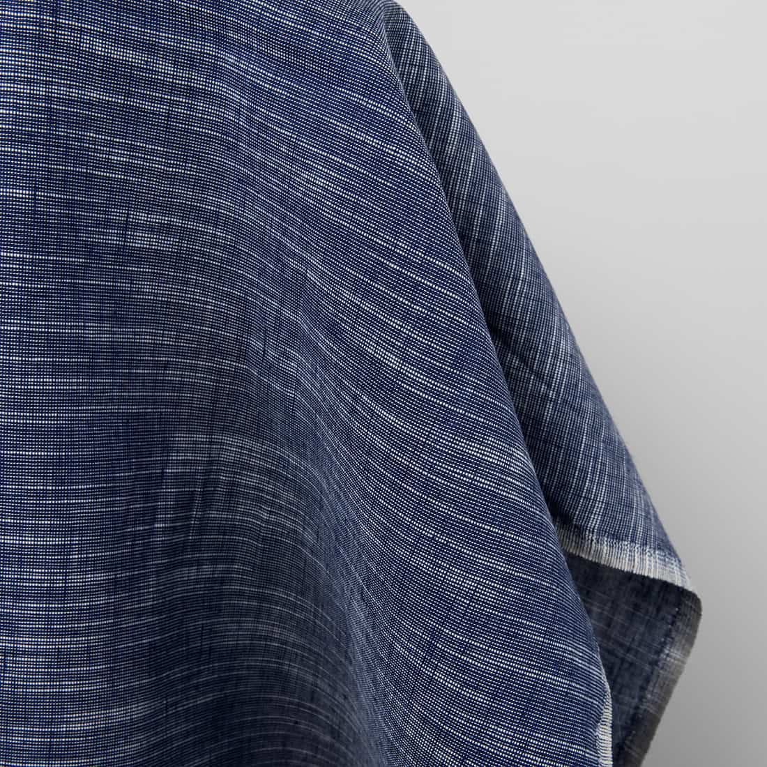 Dunkelblaues Halbleinen mit weißen Baumwoll-Effektgarnen. Interessante unregelmäßige Stoffstruktur. Der mittelschwere, dicht gewebte Halbleinenstoff hat einen breiten Verwendungsbereich: von Bettwäsche, Gardinen, Tischwäsche bis Bekleidung und Accessoires.