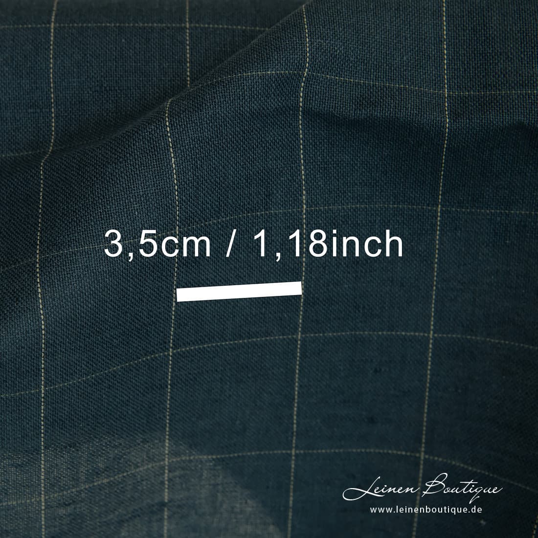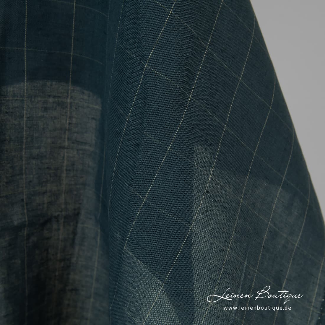 Graublau kariertes Halbleinen. In dem Stoff haben wir dunkles graublaues Leinen- und Baumwollgarn zusammengewebt, ihn mit großen Karos in gepunkteten grünlichgrauen Linien verschönert. Der Stoff ist leicht, dicht, teilweise durchsichtig.