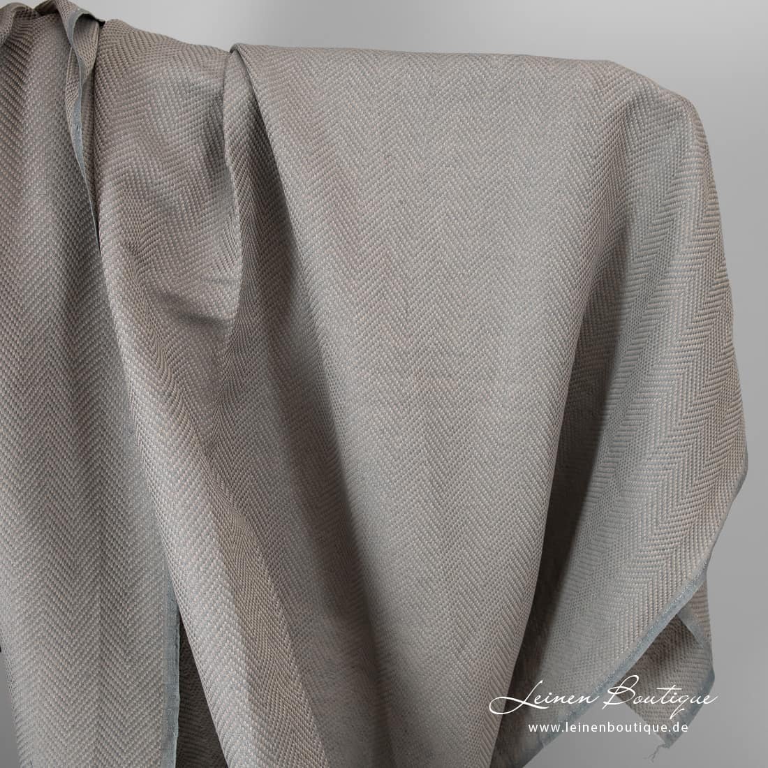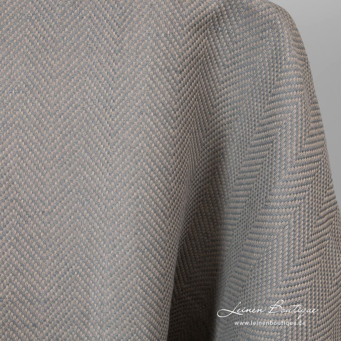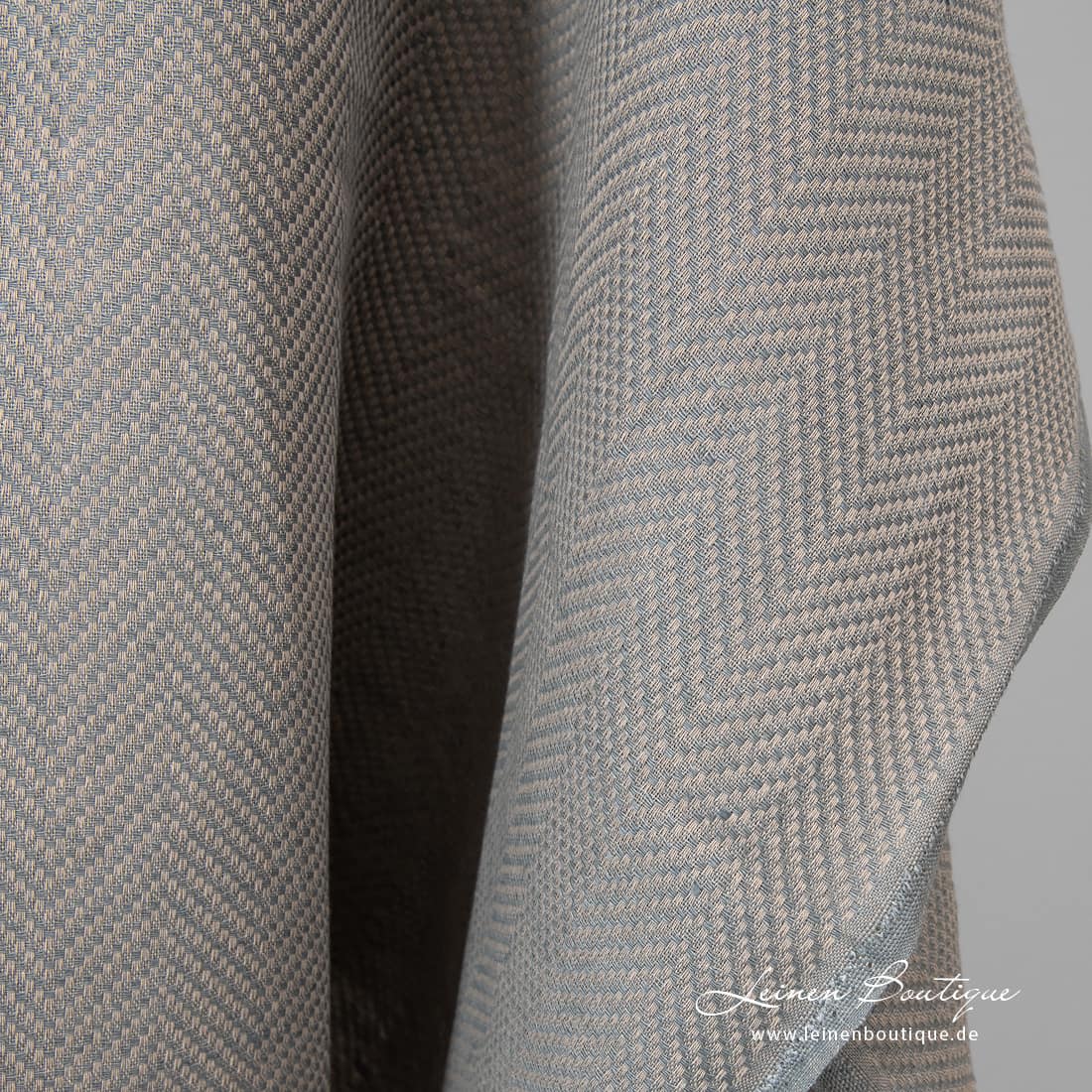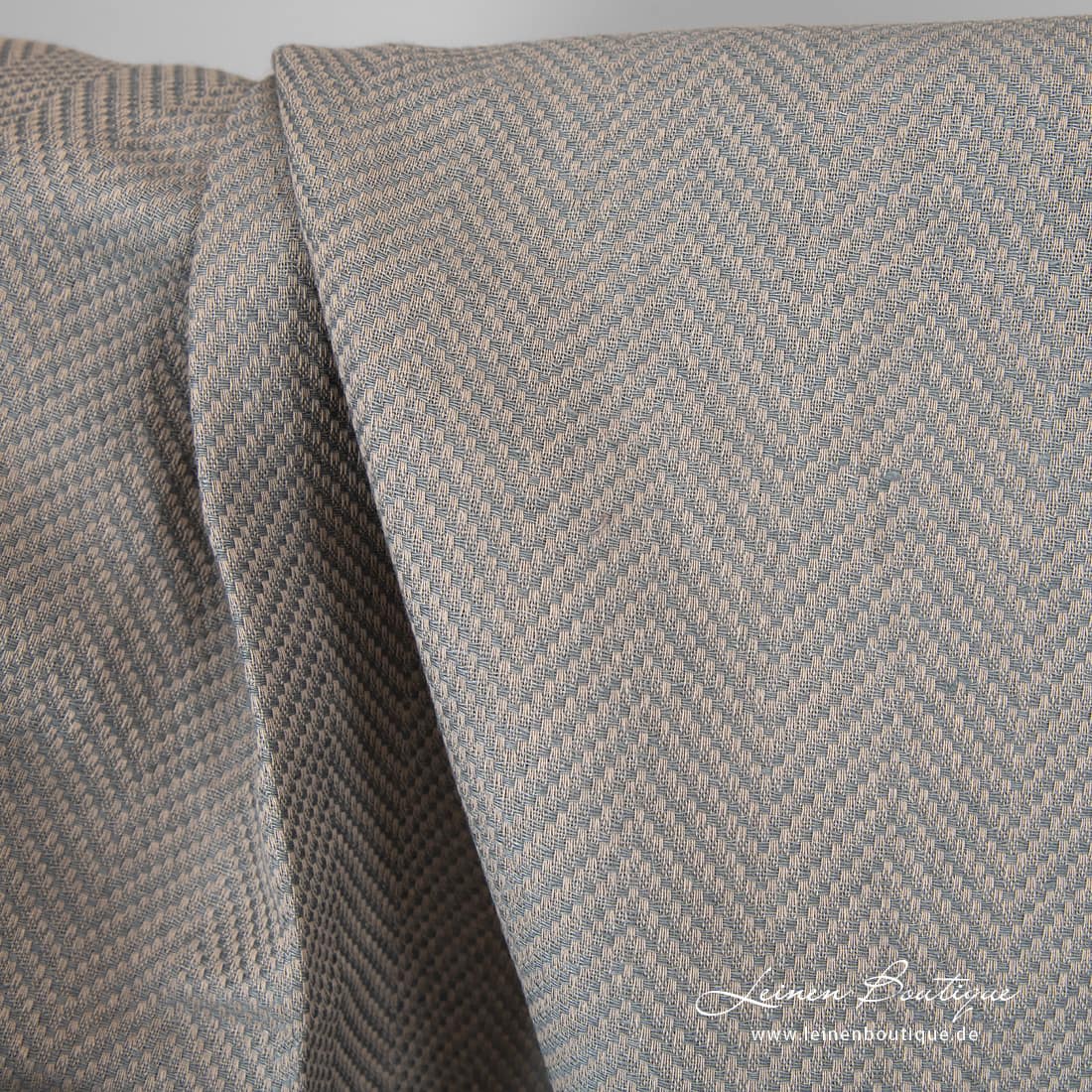 Bläulichgraues Halbleinen in Fischgrat aus beigem (sandfarbenem, graubräunlichem) Garn gewebt. Reißfest, dicht, mitteldick, zum Nähen von Bekleidung, Tischwäsche, Gardinen passend.