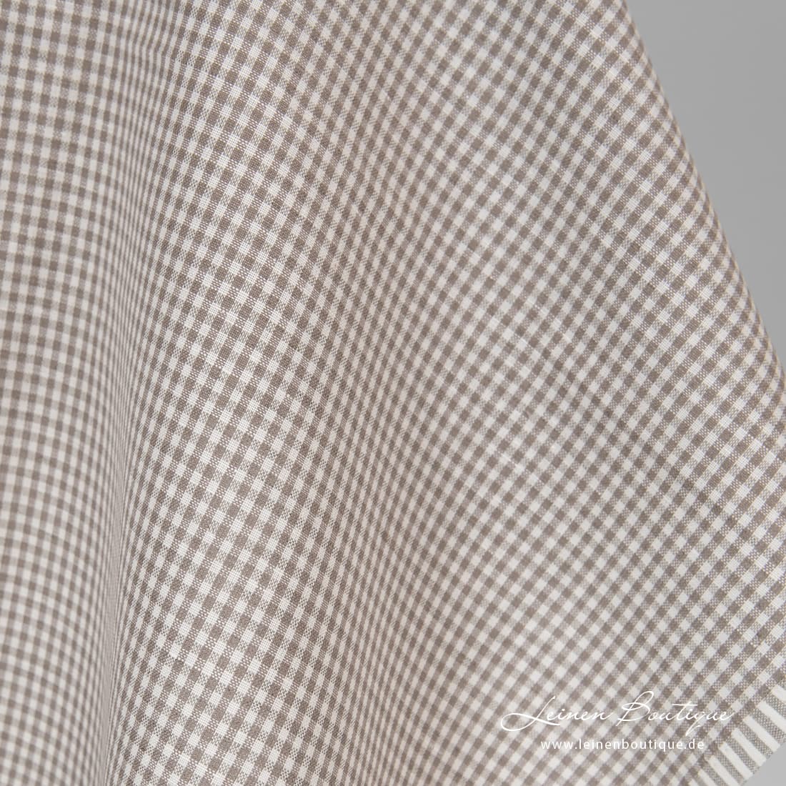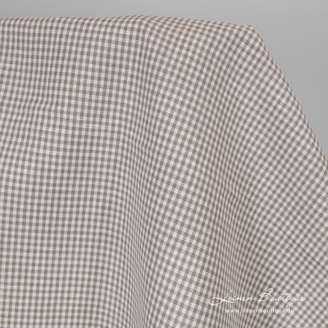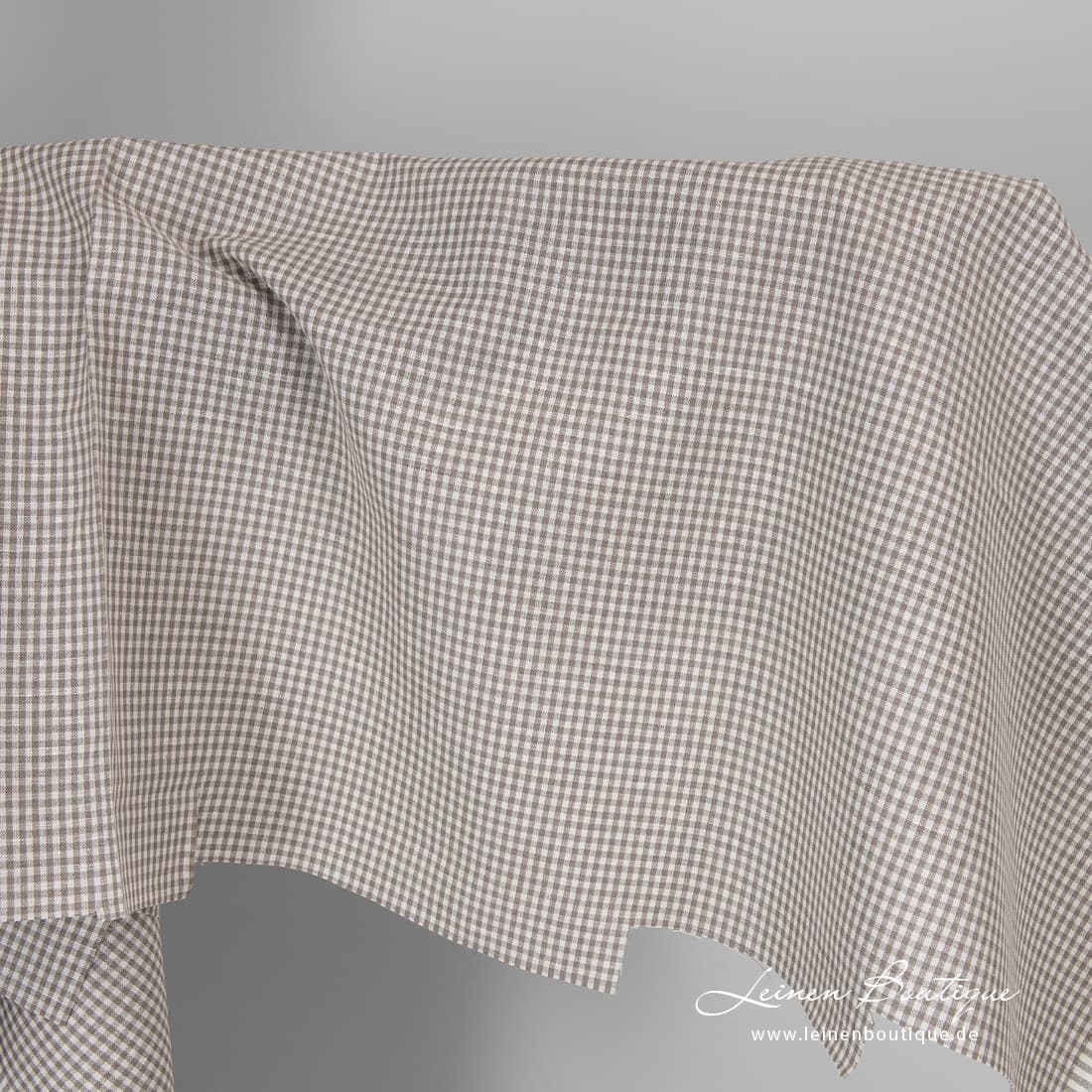 Halbleinen bräunlich kariert, aus milchweißem (gelblichweißem), naturgrauem (ungefärbtem, bräunlichgrauem) und dunklem braungrauem Leinen- und Baumwollgarn gewebt. Reißfest, dicht, leicht, mitteldick, für Bekleidung und Heimtextilien geeignet.