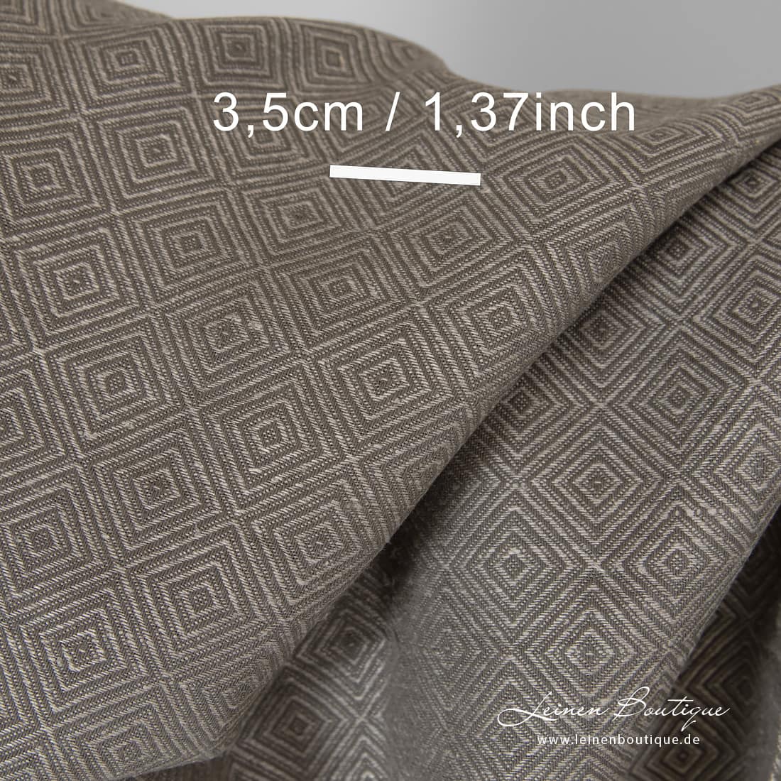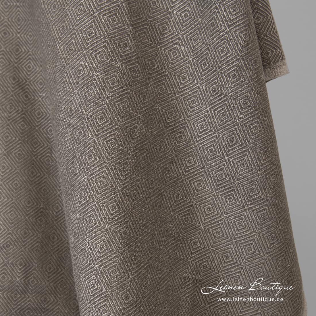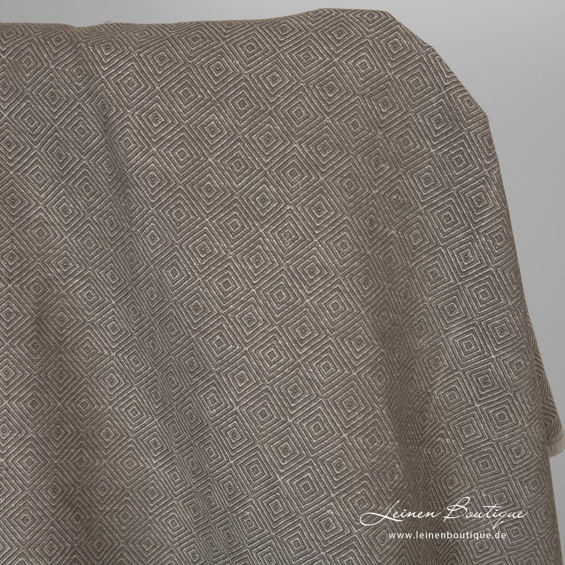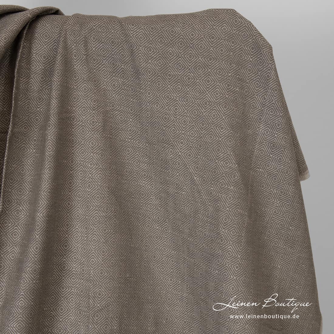 Halbleinen mit braunem Diamantmuster. Der Stoff ist aus naturgrauem (ungefärbtem, bräunlichgrauem) Leinen- und graubraunem Baumwollgarn gewebt worden. Reißfester, dichter Stoff für Heimtextilien und Bekleidung.