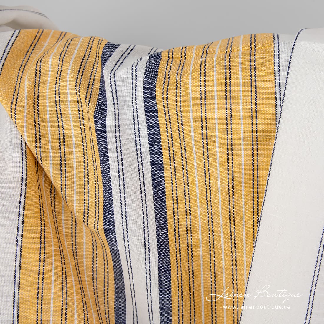 Milchweißer (gelblichweißer) Leinen-Baumwollstoff mit vertikalen gelben und blauen Streifen in verschiedenen Breiten. Reißfest, dicht, mitteldick.