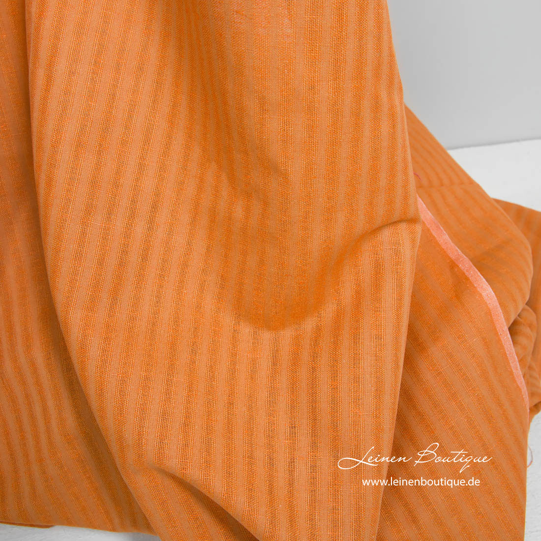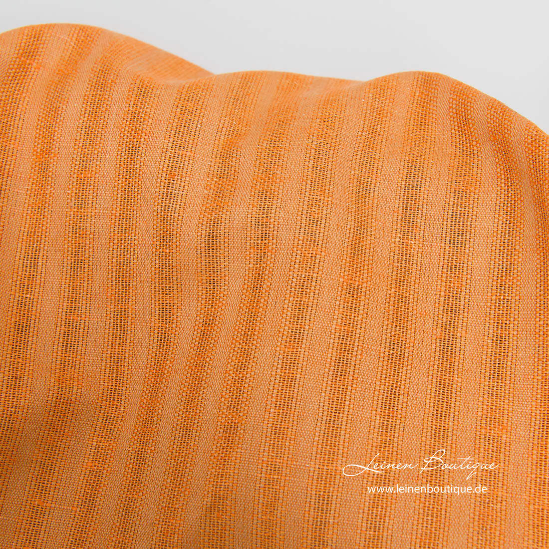 Halbleinen orange gestreift. Vertikale Streifen aus hellbraunen Garnen sind dicht gewebt, breitere orange Streifen sind durchsichtig, Ajour, nicht so dicht gewebt. Der Stoff ist reißfest, mitteldick.