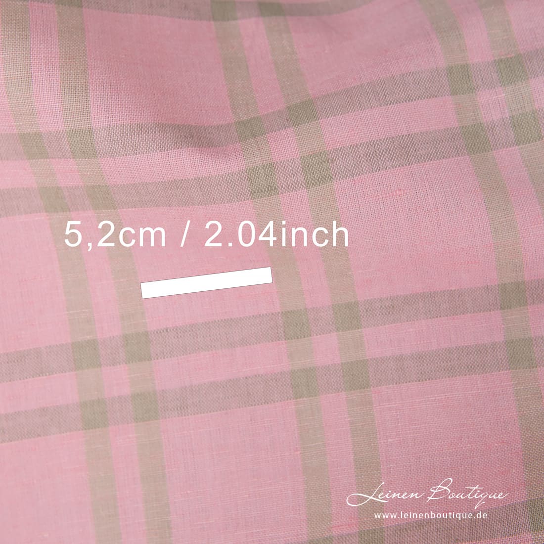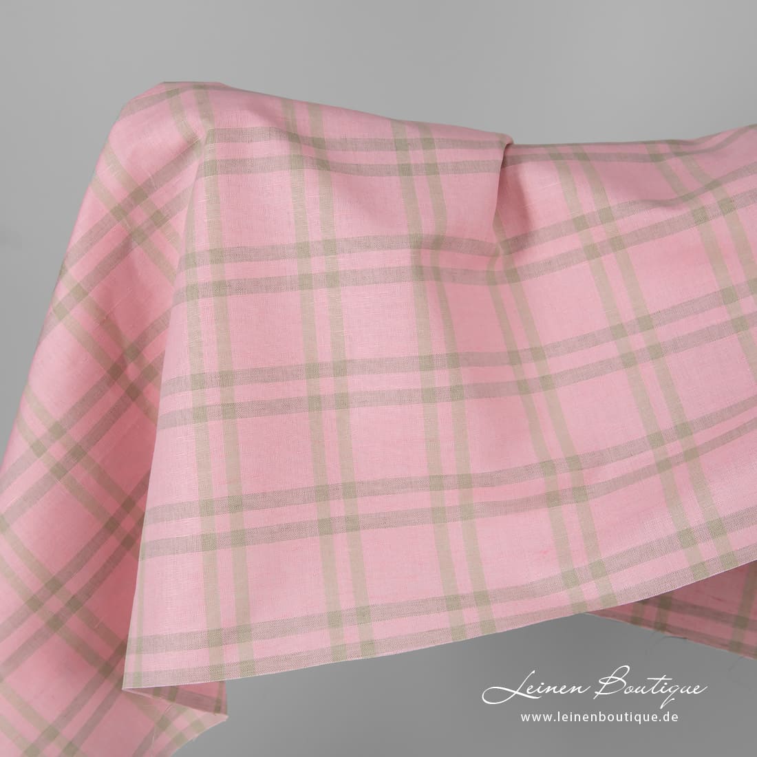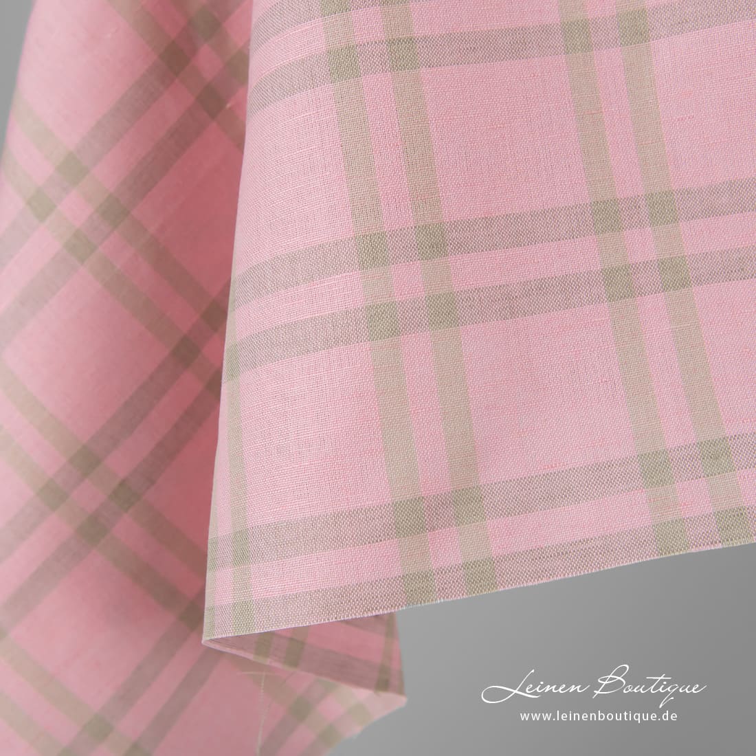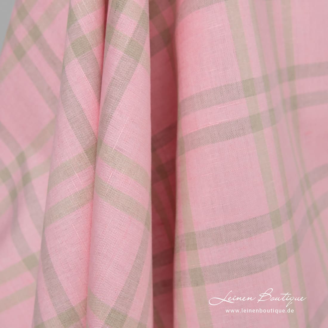 Halbleinen rosa kariert, aus rosa, naturgrauem (bräunlichgrauem) Leinen- und hellem beigem Baumwollgarn gebebt. Reißfest, dicht, mitteldick. Aus dem Stoff kann man Bekleidung und Heimtextilien (Tischdecken, Servietten, Gardinen, Bettwäsche, Schürzen) nähen.