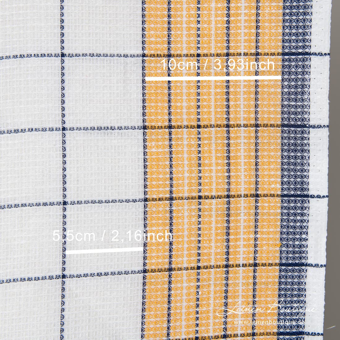 Küchentücherstoff schneeweiß, gelb, blau kariert, in Waffelpique. Dicht gewebt, leicht und reißfest. Für Küchentücher geeignet.